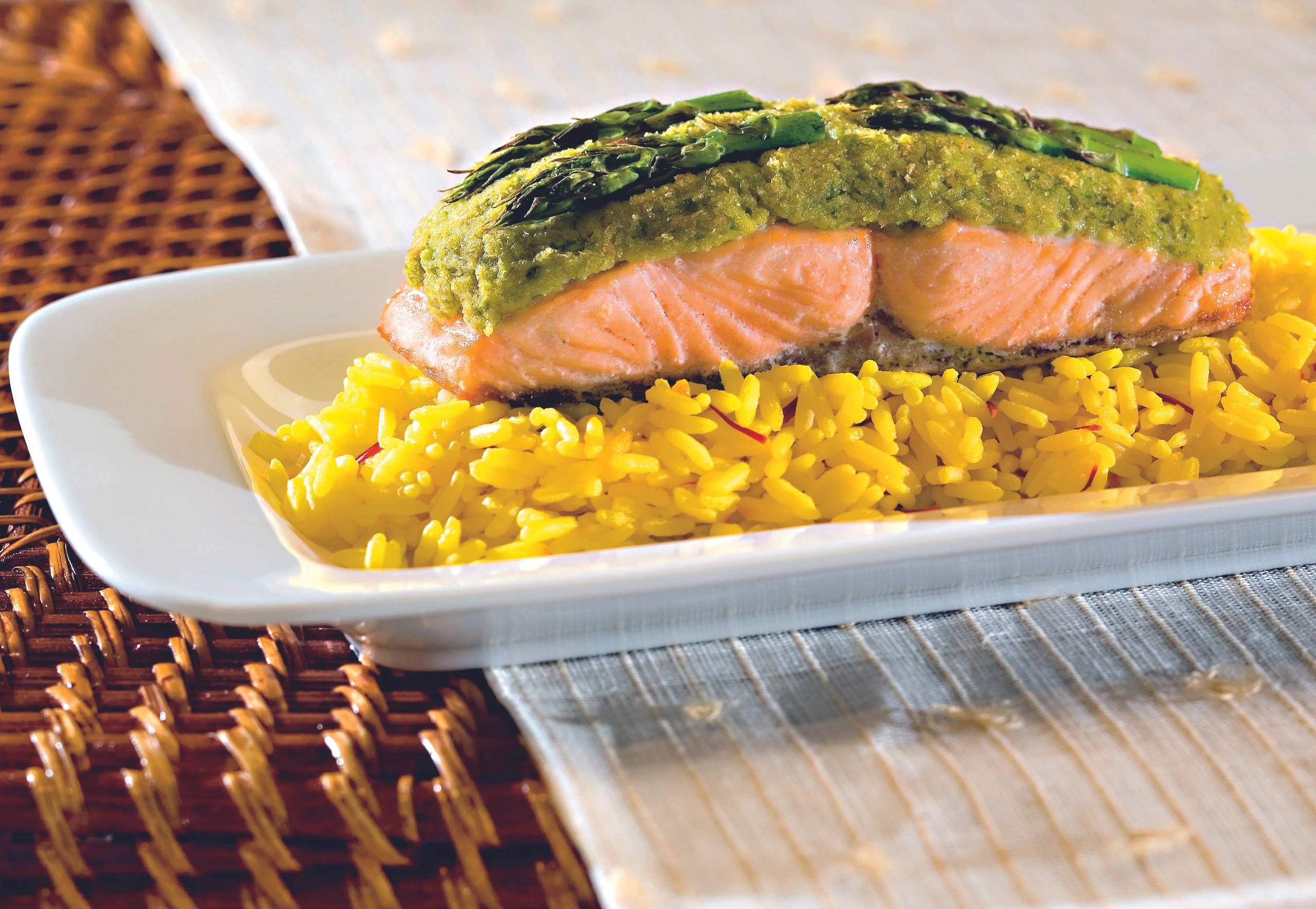 Spargelcreme auf die Lachsstücke streichen, Spargelspitzen darauf legen und leicht andrücken. Im Rohr (mittlere Schiene / Gitterrost) kurz überbacken. Lachs auf dem Safranreis anrichten.
