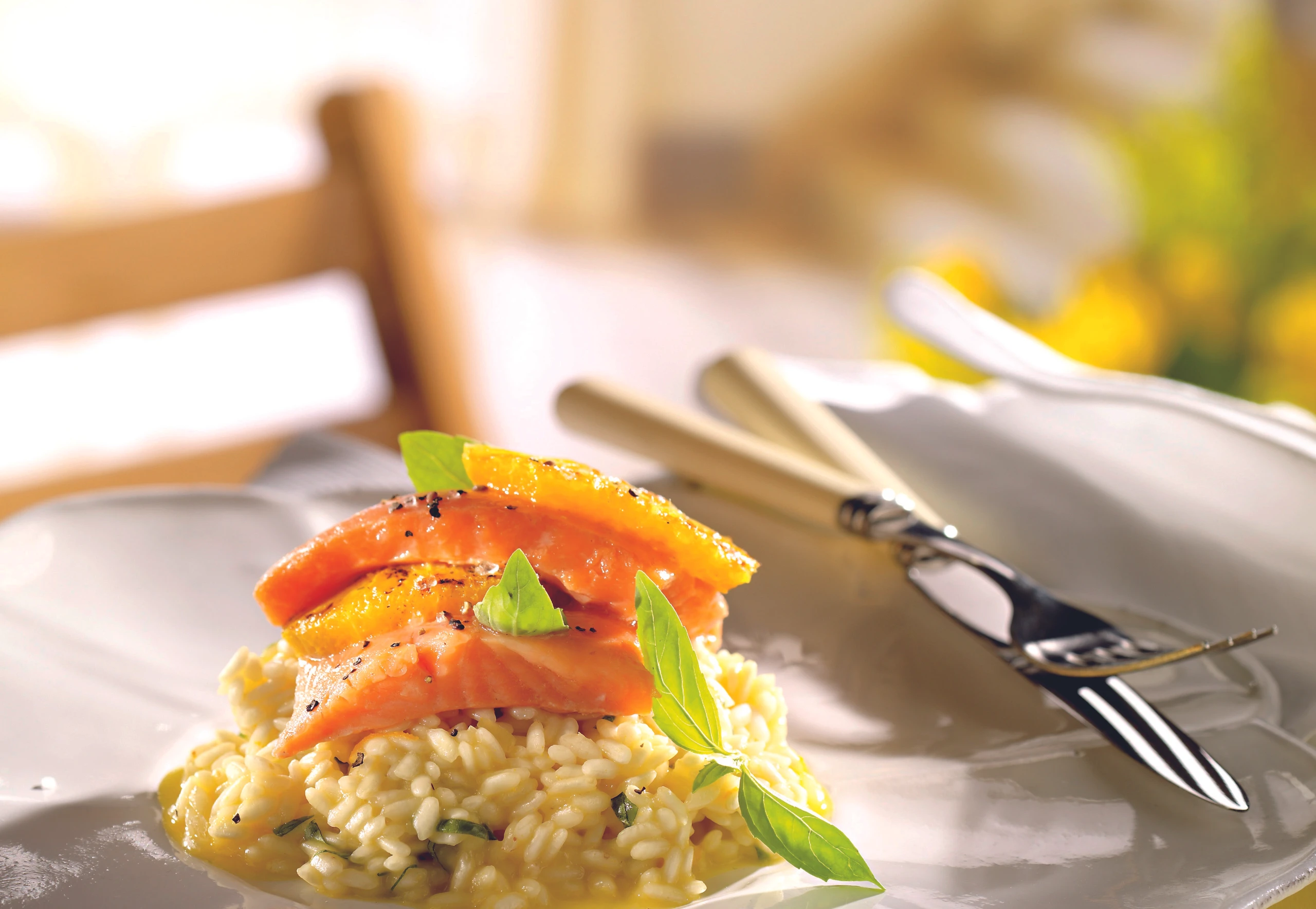 Parmesan, Butter und Basilikum in das Risotto rühren. Risotto mit Lachs anrichten, mit Orangenscheiben und Basilikum garnieren.