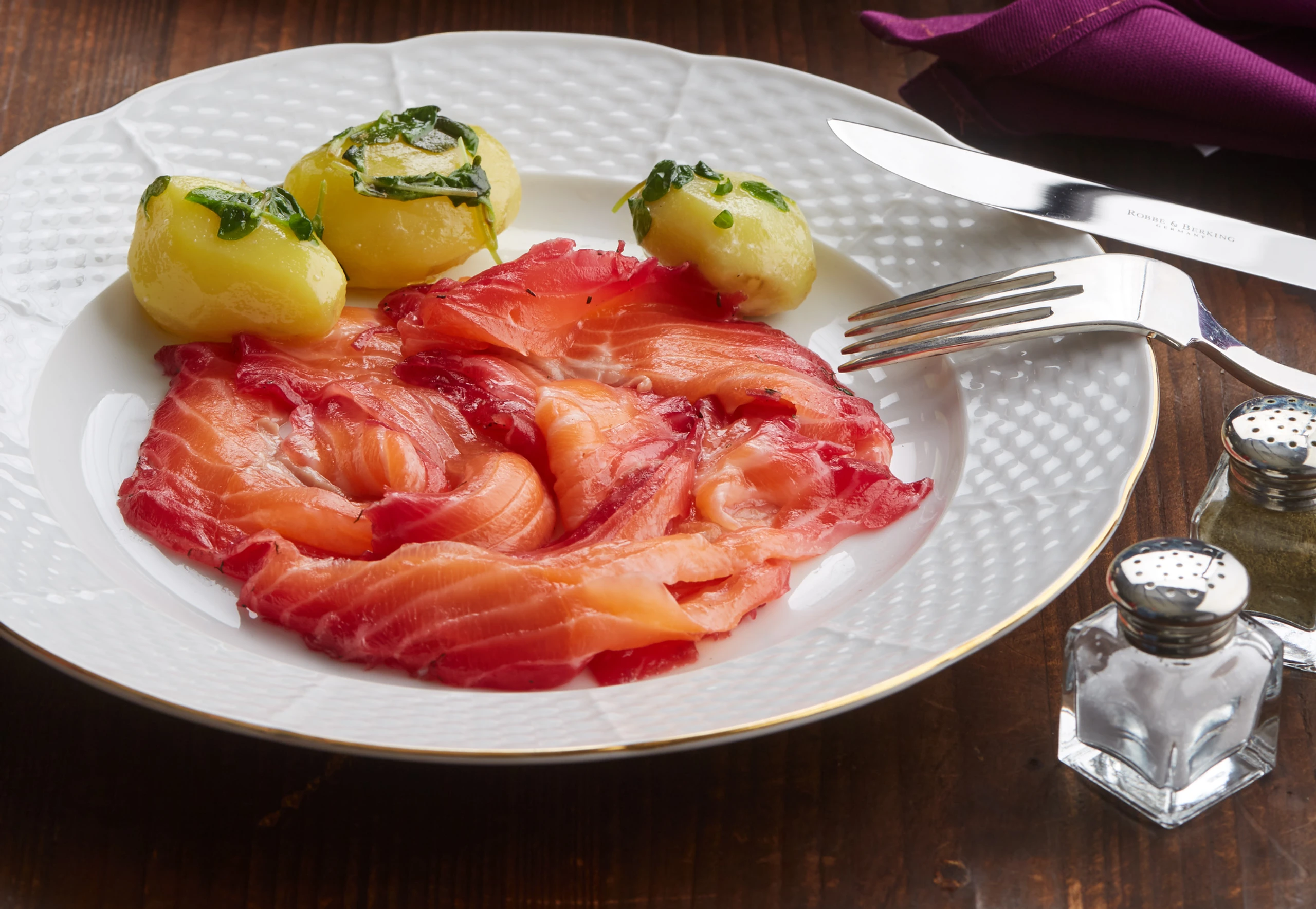 Filet auswickeln und die Beize mit einer Teigkarte oder einem Messerrücken behutsam entfernen. Filet mit einem schmalen Messer in dünnen Scheiben von der Haut schneiden, mit den Erdäpfeln anrichten und mit Zitronenscheiben garniert servieren.