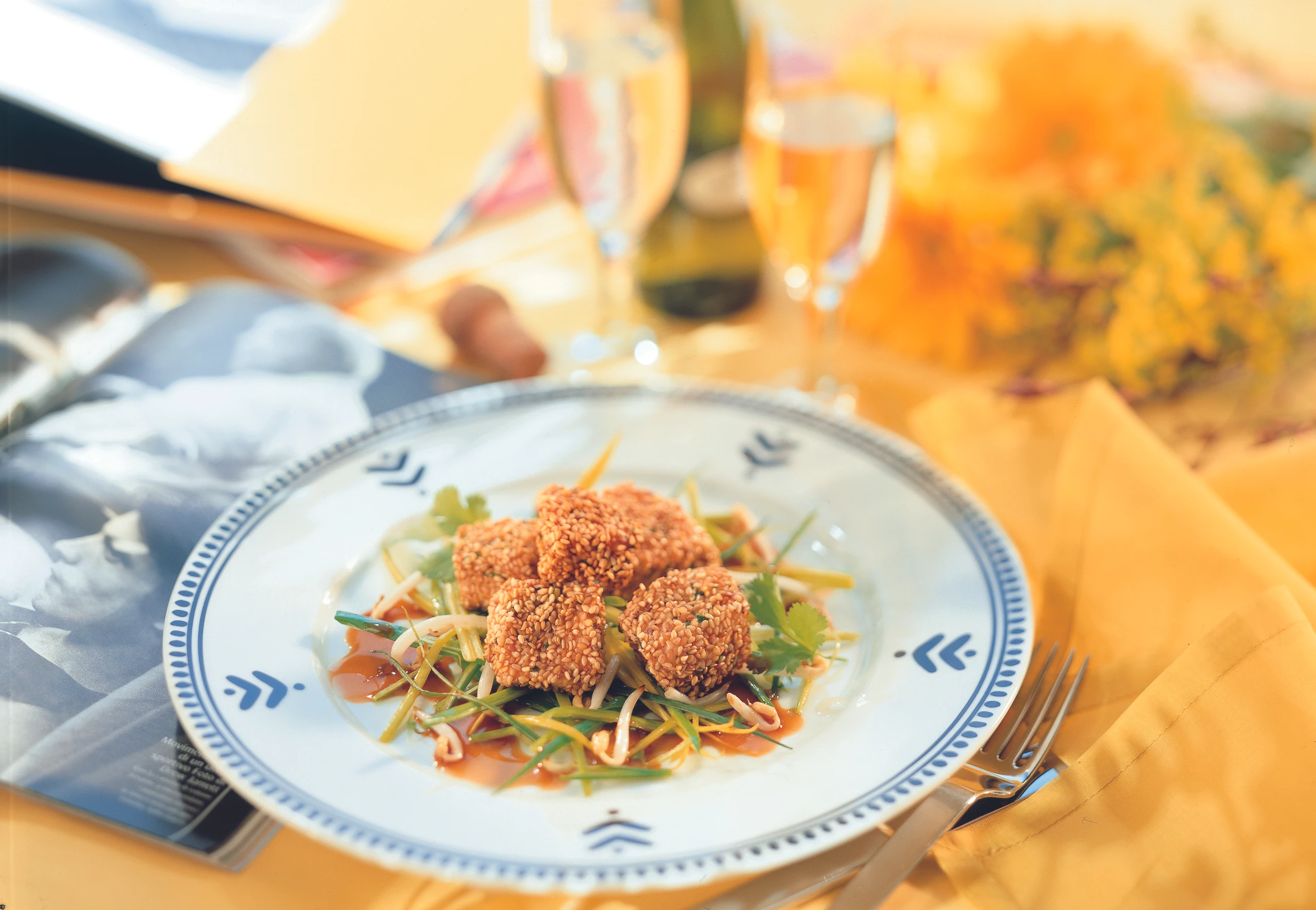 - Eiklar ein wenig verschlagen. Lachswürfel salzen, mit Limettensaft beträufeln, durch das Eiklar ziehen und im Sesam wenden.
