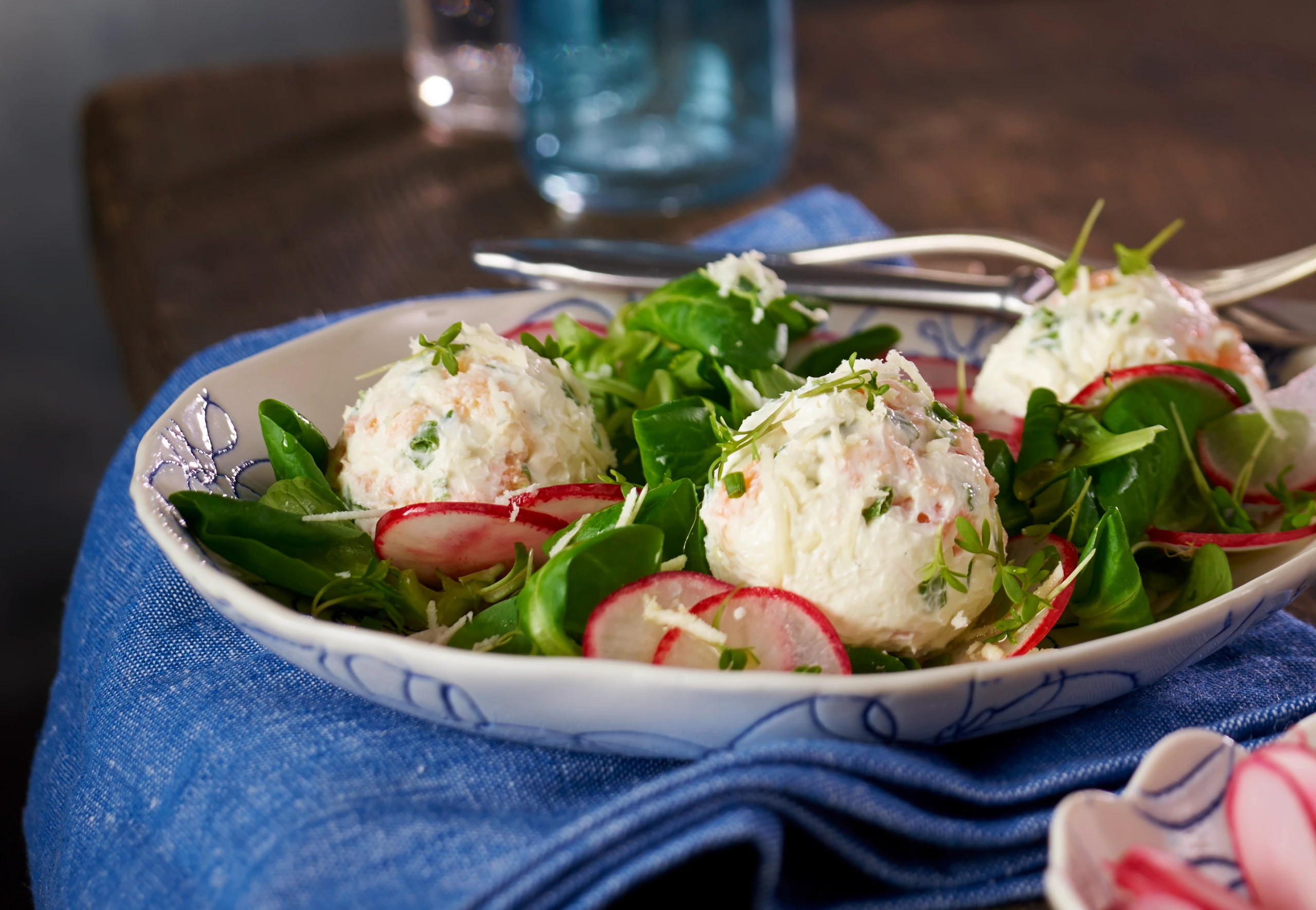 Vogerlsalat und Radieschen mit der Marinade vermischen. Bällchen mit dem Salat anrichten und mit übrigen Kräutern und Kren bestreut servieren.