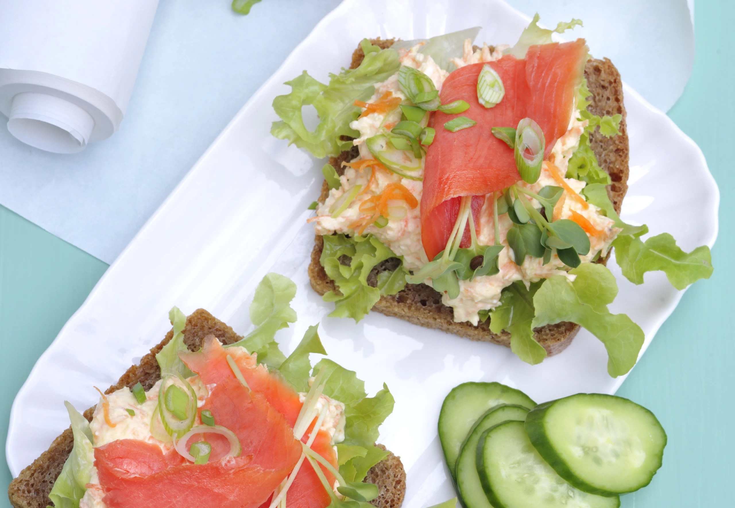 - Brote mit Salatblättern belegen, Karottencreme darauf verteilen. Räucherlachs, Jungzwiebeln und Kresse darauf geben. Brote mit Gurkenscheiben anrichten.