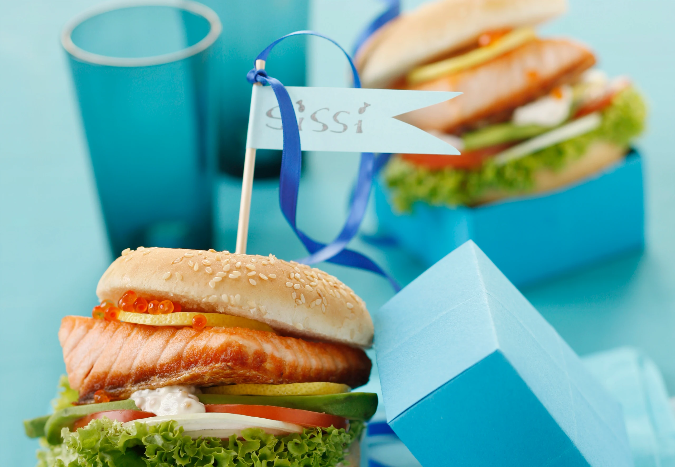 Weckerl aufschneiden, Unterseiten mit etwas Senfrahm bestreichen und mit Salatblättern belegen. Avocado, Paradeiser, und Zwiebel darauflegen. Lachs daraufgeben und mit Zitronenscheiben belegen. Mit Senfsauce und Kaviar abschließen. Deckel daraufsetzen, Burger eventuell mit Spießen fixieren.