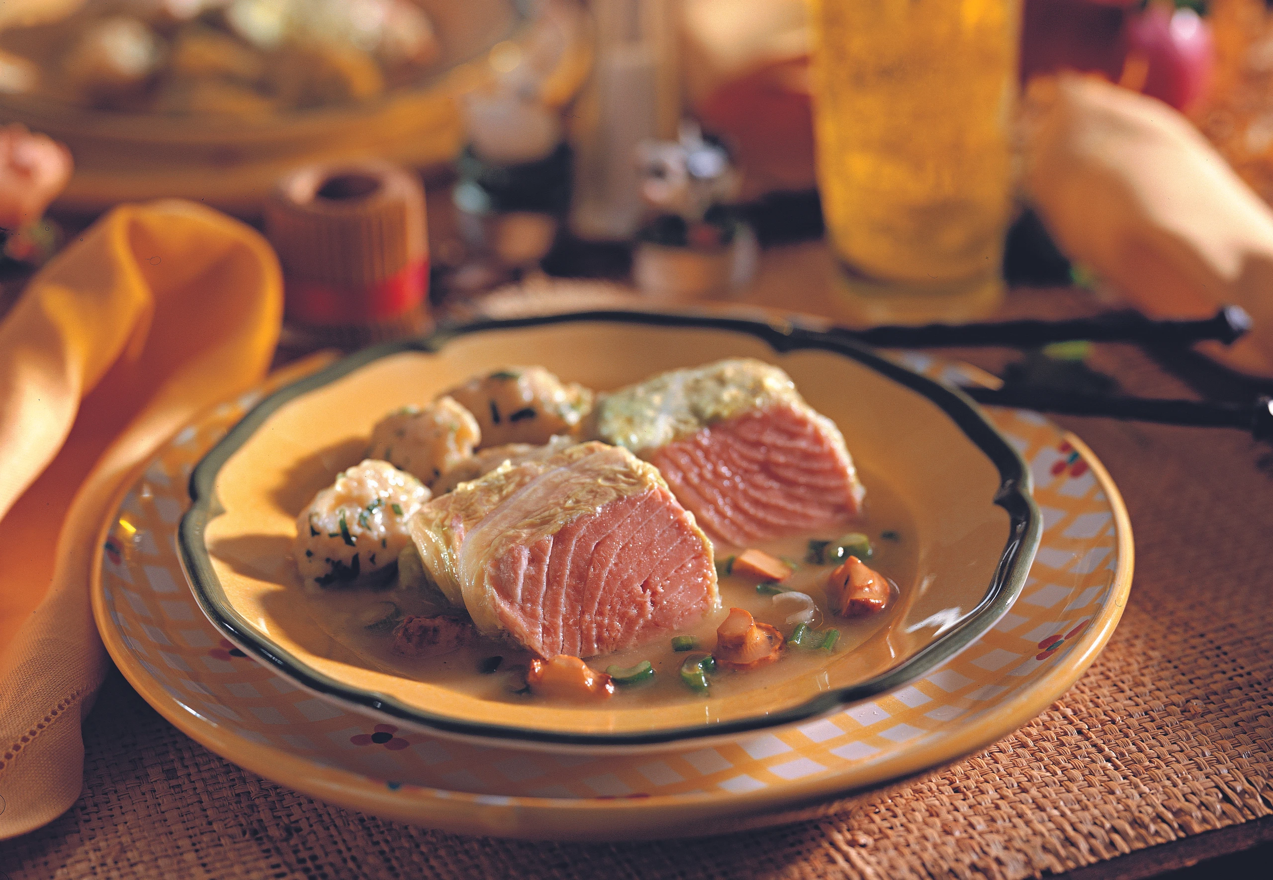 Fisch aus der Form heben, gut abtropfen lassen und warmstellen. Den beim Garen entstandenen Fond für die Zubereitung des Eierschwammerl-Fonds verwenden und mit dem Fisch servieren.