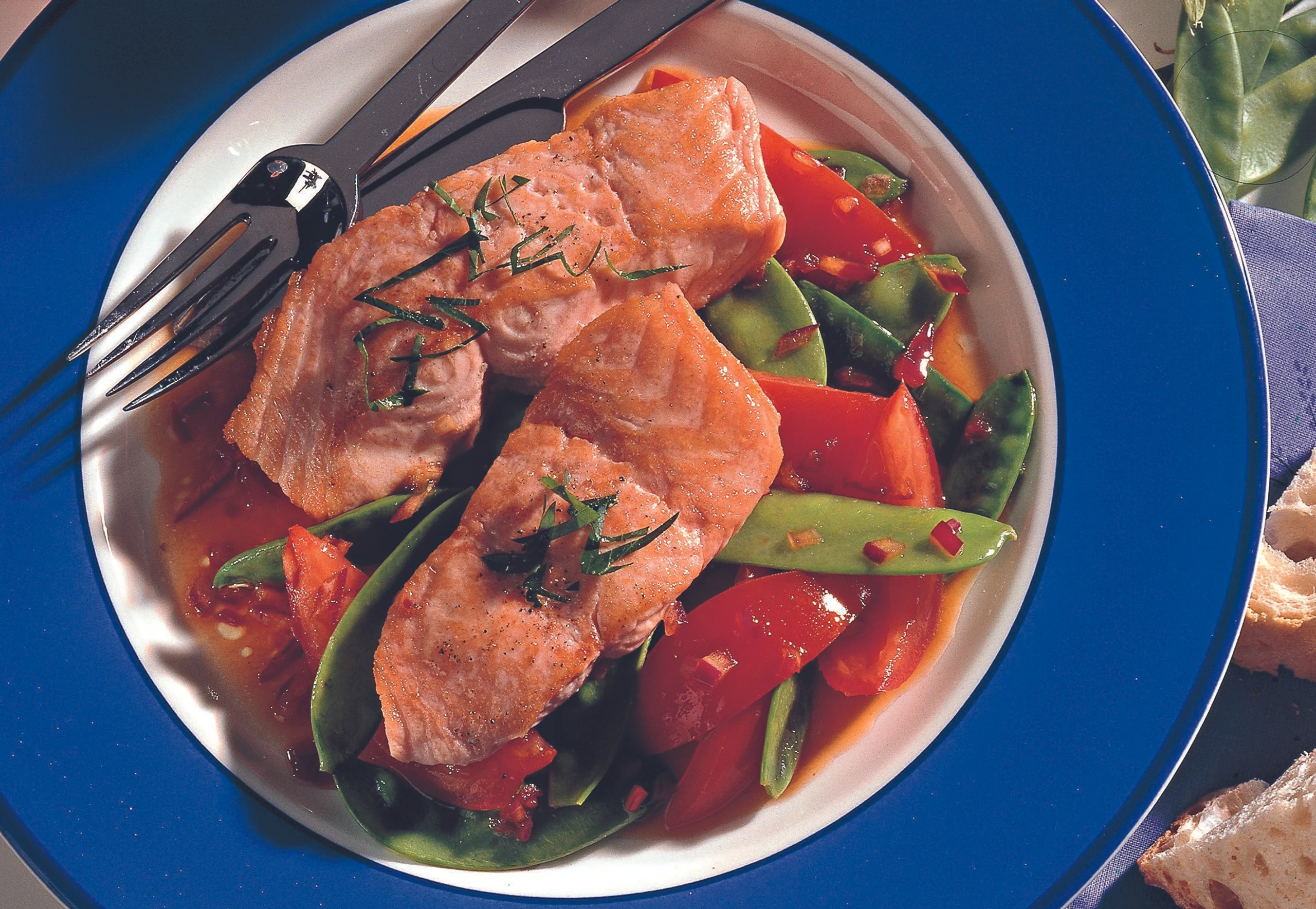 Lachsfilet auf Erbsenschoten-Paradeis-Salat
