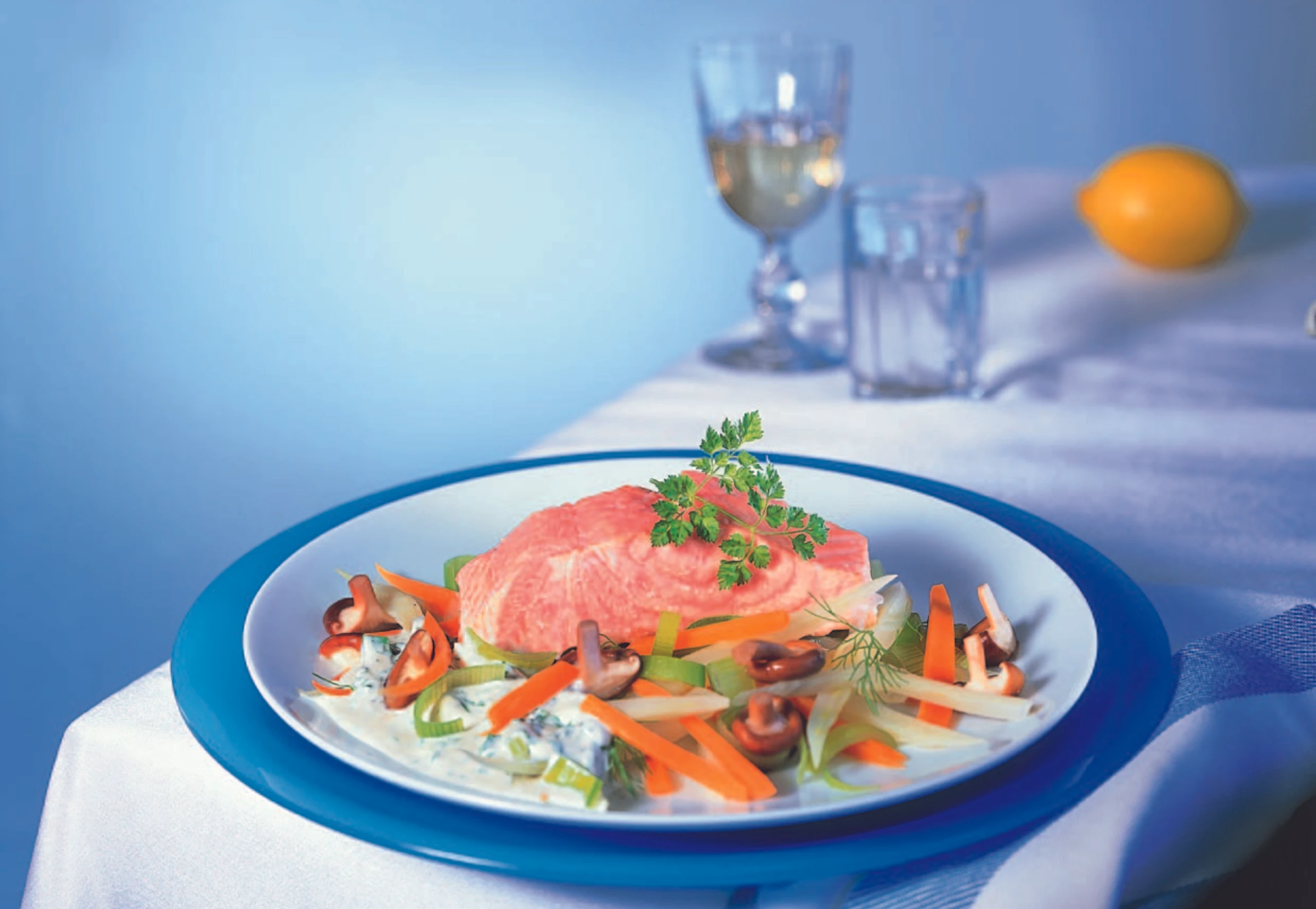 Fischfilets in 2 möglichst gleich große Stücke schneiden, salzen, pfeffern und auf das Gemüse legen. Fischfilets zugedeckt ca. 8 Minuten dünsten.