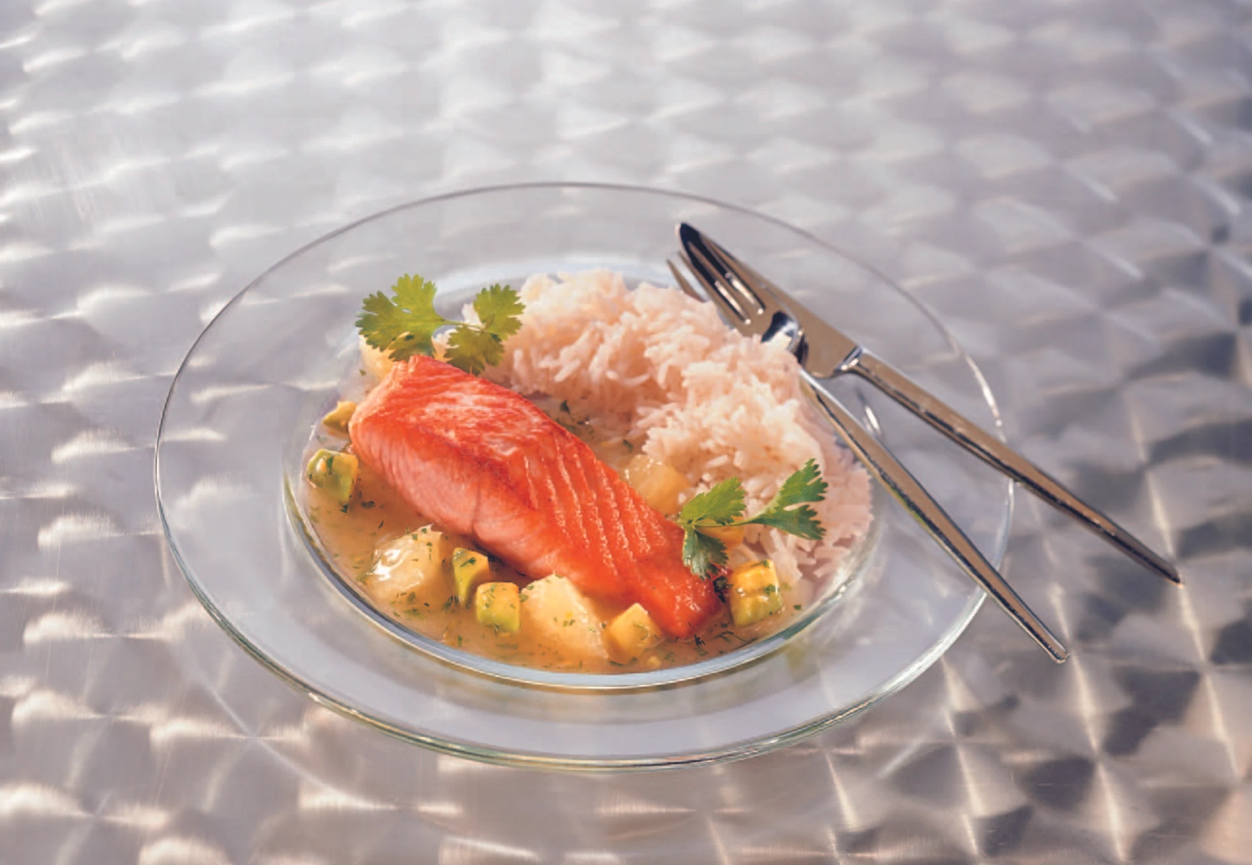 Bratfett abgießen. Bratrückstand mit Suppe oder Fischfond ablöschen und aufkochen. Stärke mit 2 EL Wasser vermischen, in die Sauce rühren und aufkochen. Koriander sowie Grapefruit- und Avocadostücke einrühren und kurz ziehen lassen. Lachsfilets mit der Sauce anrichten. Dazu passt Basmatireis.