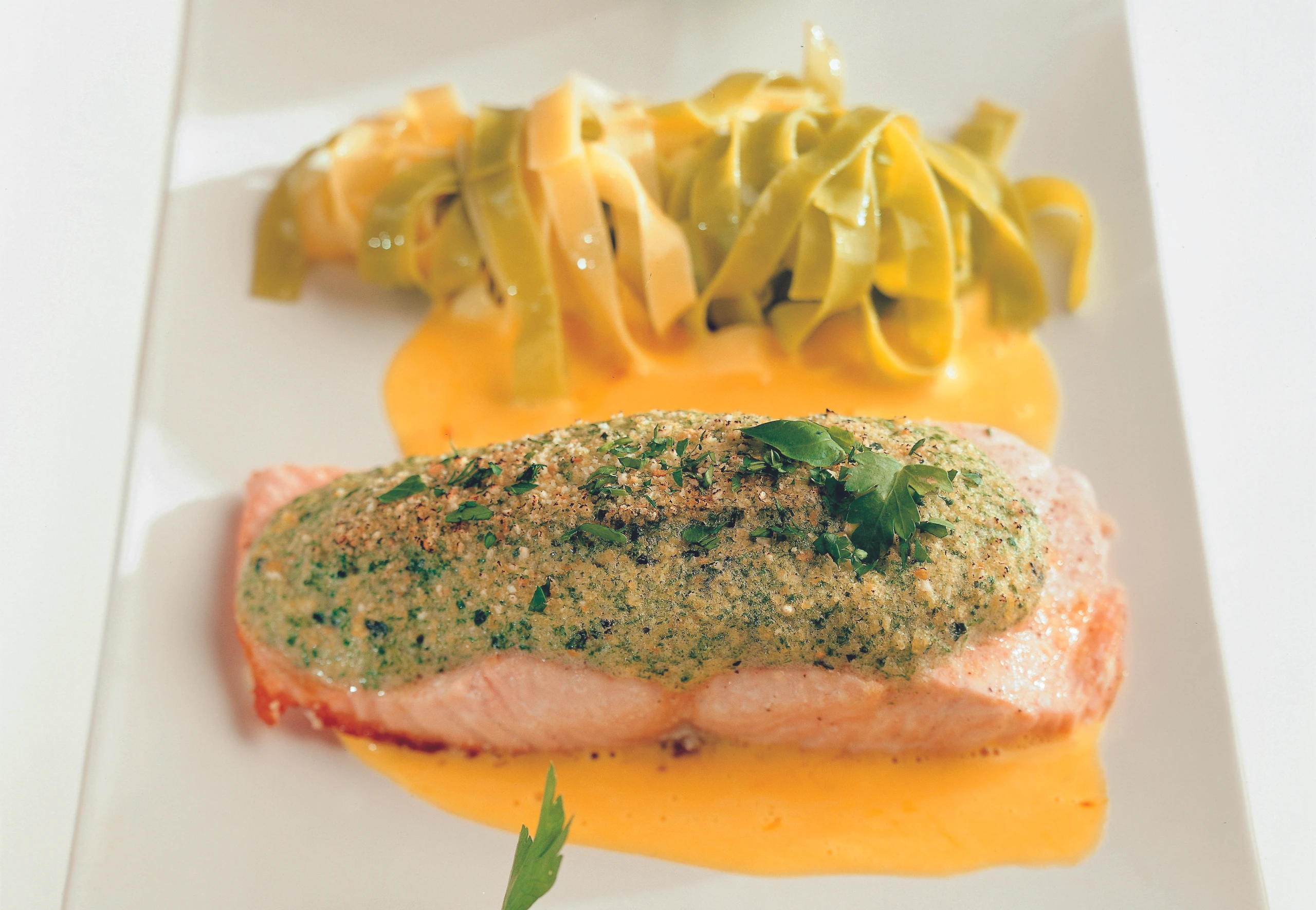 Sauce nochmals aufkochen. Überbackene Lachsfilets mit der Sauce anrichten. Als Beilage passen Tagliatelle.