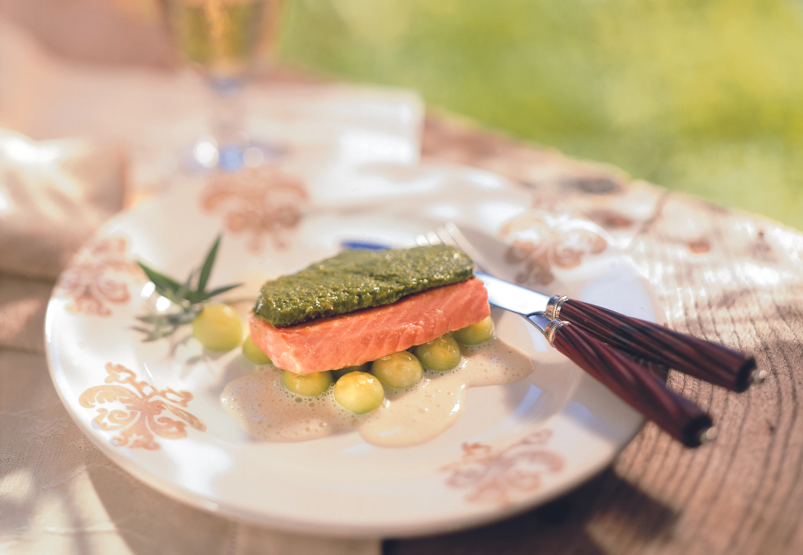 Lachsfilet mit Kräuterhaube und Weinschaum