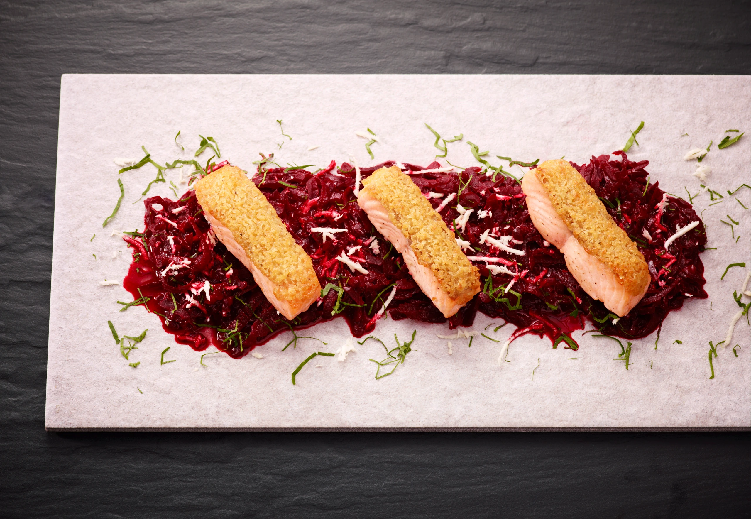 Lachs auf den Roten Rüben anrichten, eventuell mit Petersilie und Kren garniert servieren.