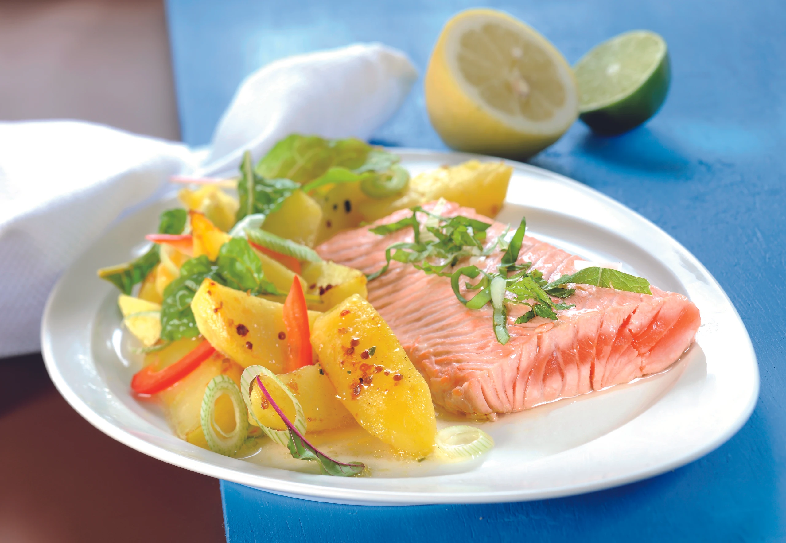 Erdäpfel mit Jungzwiebel, Paprika und Spinat mischen. Lachs mit den Erdäpfeln anrichten und mit Zitronen-Basilikum garniert servieren.
