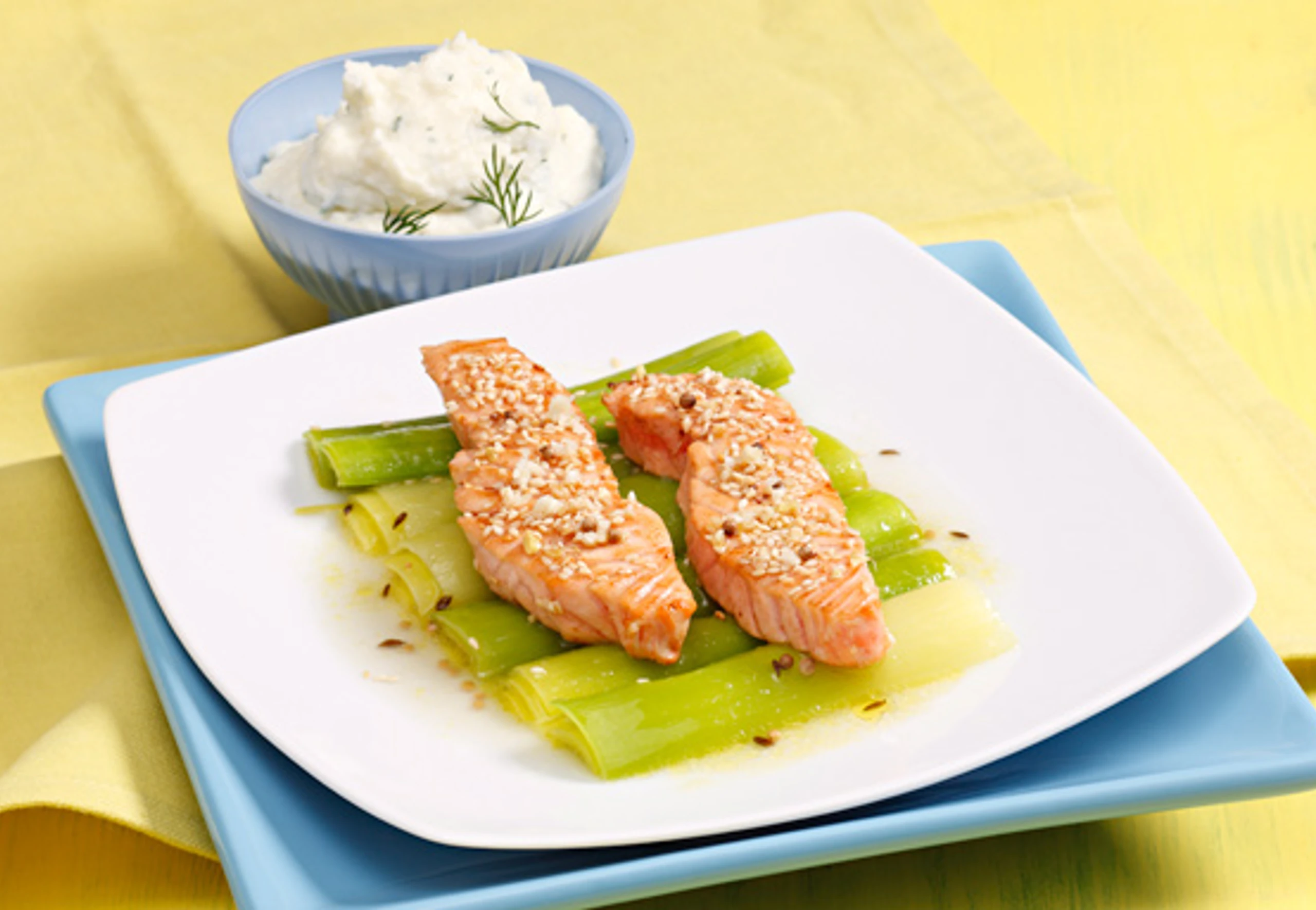 - Lachs in der Sesam-Mischung wenden, auf dem marinierten Lauch anrichten und mit dem Dip servieren.