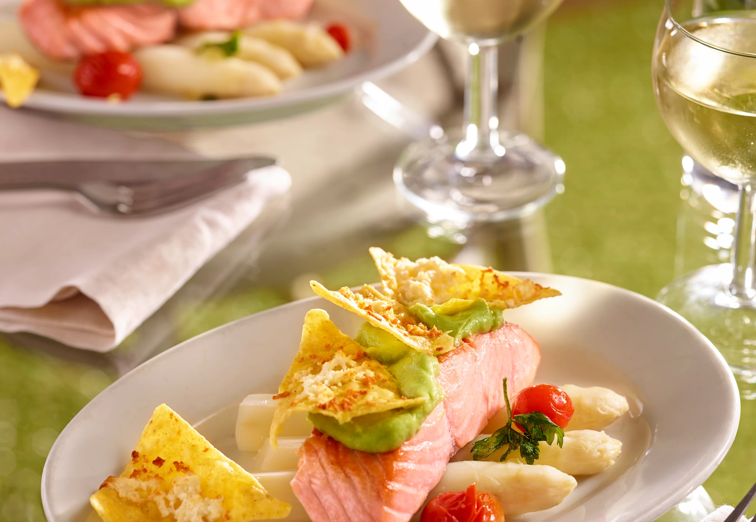 Lachs mit Spargel und Paradeisern anrichten, mit Avocadosauce, Tortillas und gebackener Petersilie garnieren.