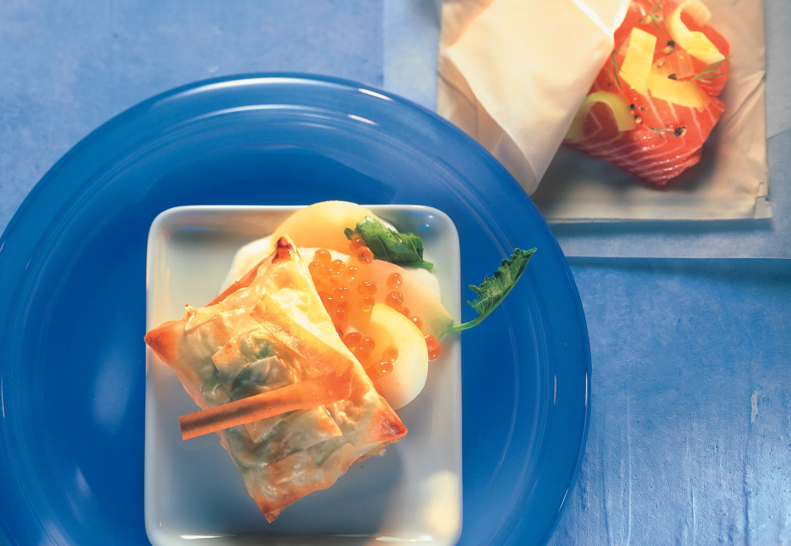 Restliche Butter schmelzen. Ein Strudelblatt auf ein feuchtes Tuch legen und mit Butter bestreichen. An den unteren Rand ein Lachsstück legen, mit einem Viertel vom Lauch bedecken und mit Dille bestreuen. Links und rechts vom Teigblatt einen 5 cm breiten Streifen wegschneiden und beiseite legen. Lachs im Teig einschlagen, die Kanten umbiegen. Lachspäckchen mit verquirltem Ei bestreichen. Einen Teigstreifen eng zu einem Röllchen wickeln, den zweiten in Stücke schneiden und das Lachspäckchen damit belegen. Päckchen mit Ei bestreichen. Aus den übrigen Zutaten drei weitere Lachspäckchen und Garnitur herstellen.