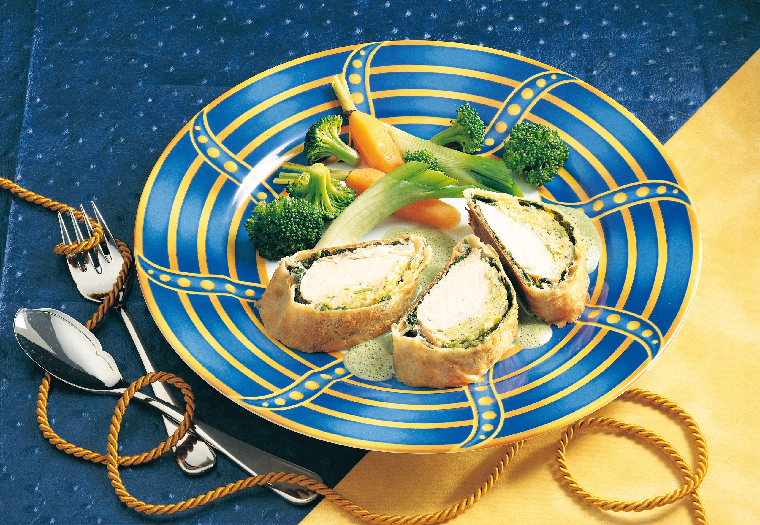 Strudelpäckchen im vorgeheizten Rohr (mittlere Schiene) ca. 20 Minuten backen, kurz rasten lassen, in Scheiben schneiden und am besten mit Jungzwiebel-, Karotten- und Brokkoli-Gemüse anrichten.