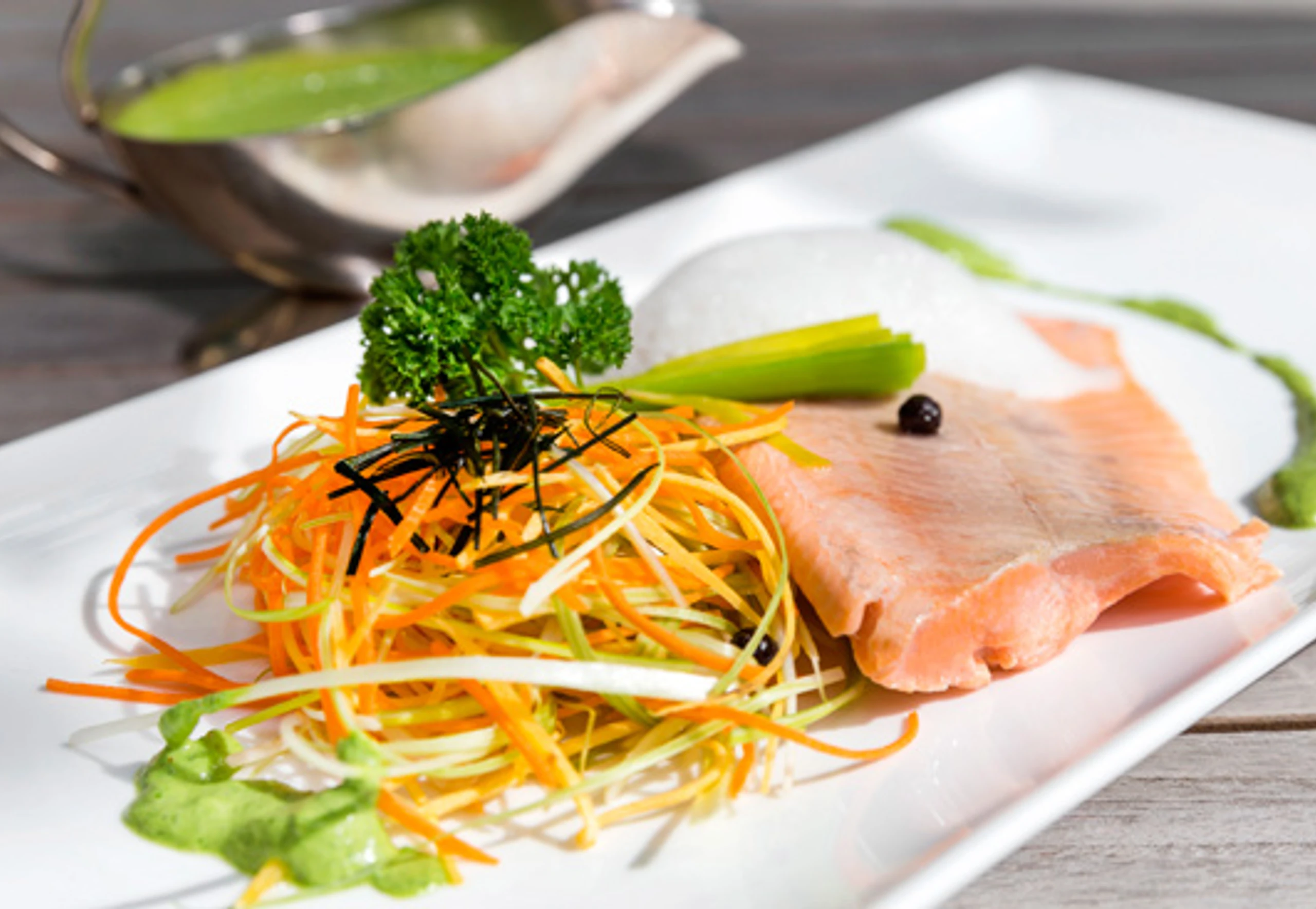 - Gemüsestreifen in 1 EL aufgeschäumter Butter schwenken, mit Salz und Pfeffer würzen. Forellenfilets aus dem Fond heben und die Haut abziehen. Filets mit Gemüse und Pesto anrichten. Eventuell mit gebackenen Lauchstreifen garnieren.