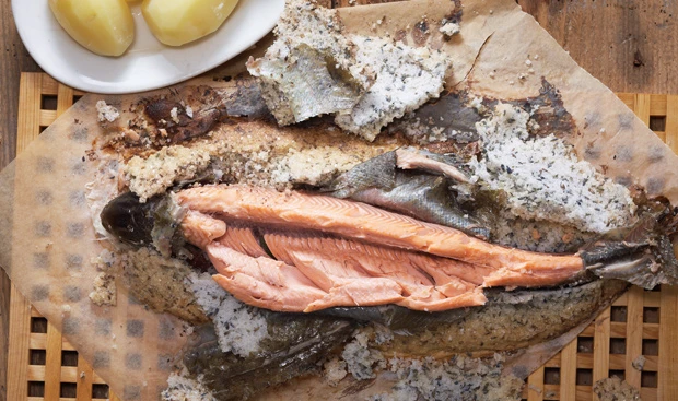 - Salzkruste mit dem Hammer aufschlagen. Kruste und Haut von der Forelle entfernen. Forelle filetieren und eventuell mit gekochten Erdäpfeln anrichten.