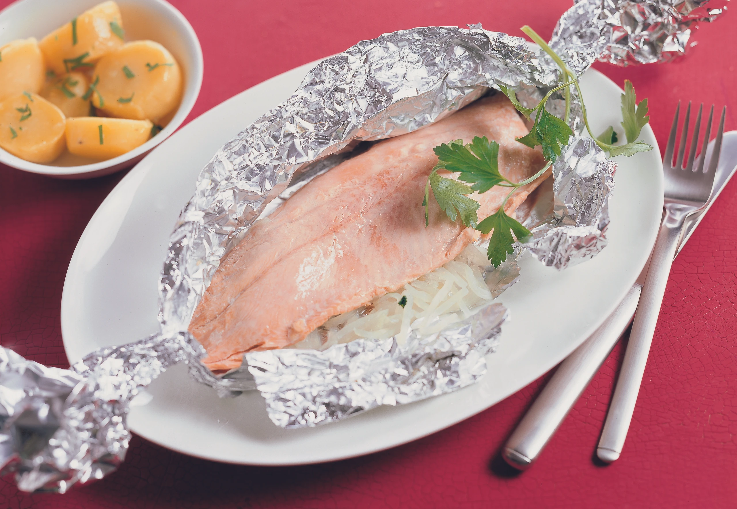 Lachsforelle mit Kohlrabi in der Folie gegart