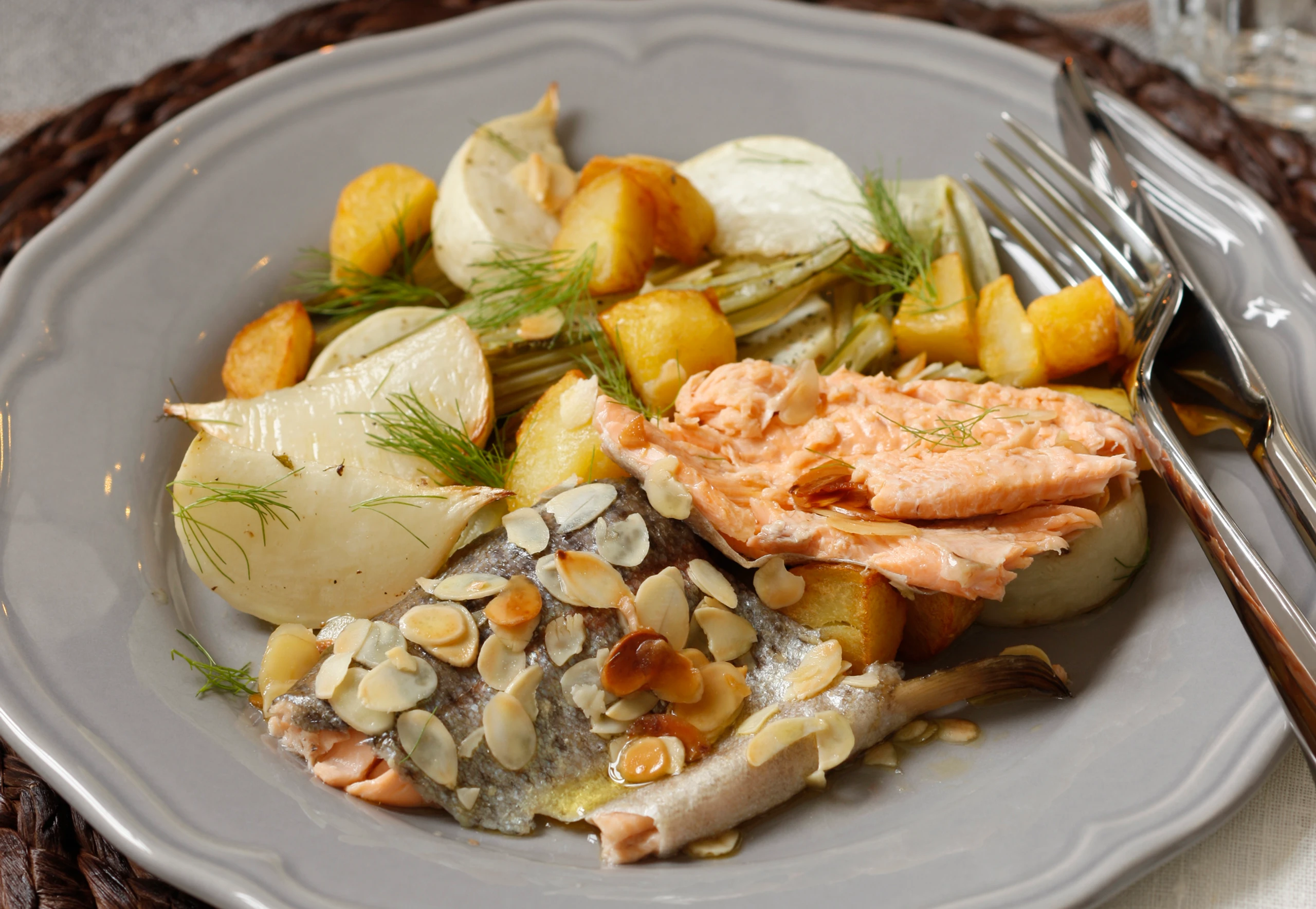 Ca. 2 EL Öl erhitzen, Erdäpfel darin braten und mit Salz würzen. Forellen aus dem Rohr nehmen, filetieren, mit Gemüse und Erdäpfeln anrichten. Mit Fenchelgrün garniert servieren.