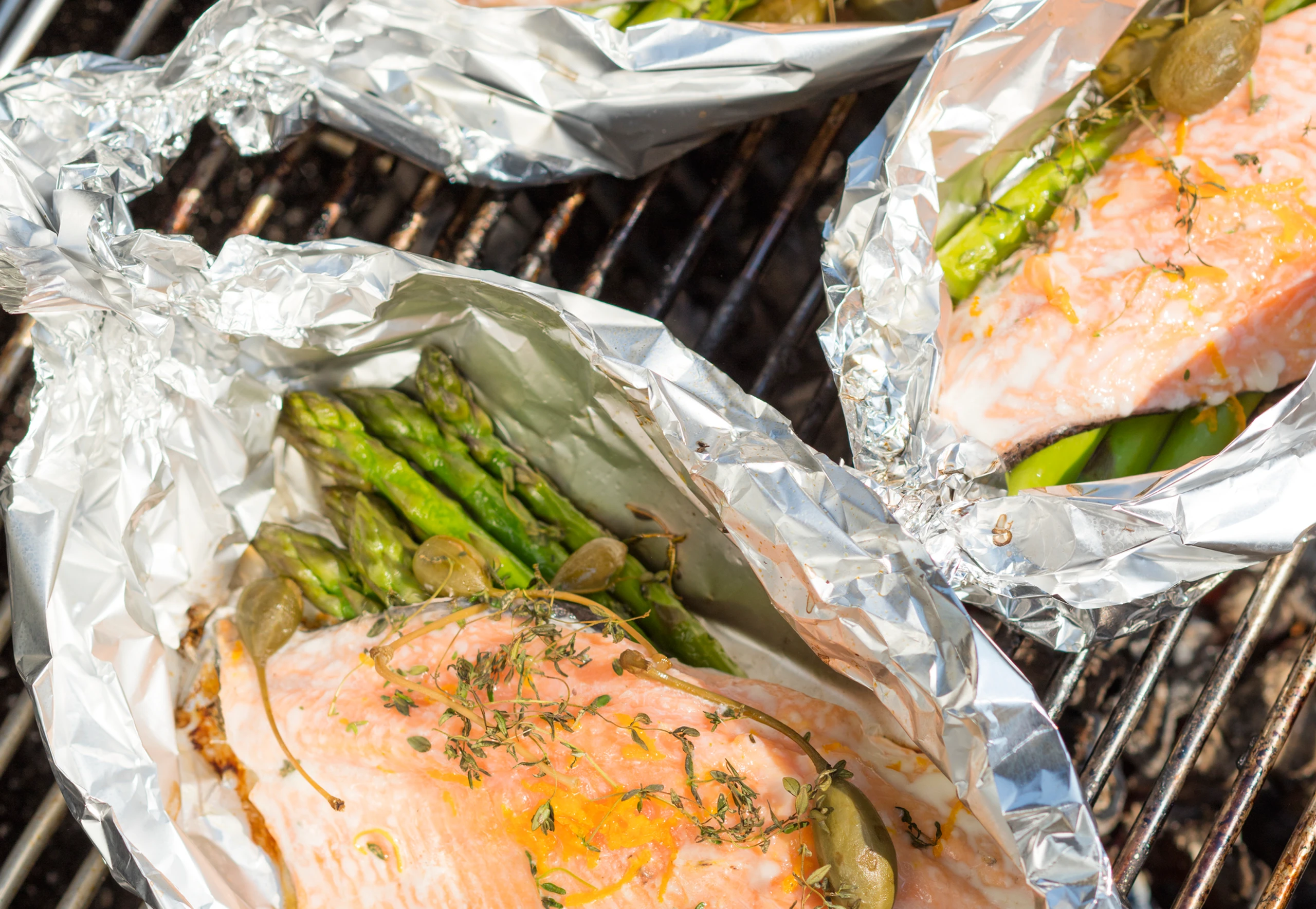 Kapern, übrige Butter, Thymian und Orangenschale darauf verteilen und mit Weißwein und je 1 TL Olivenöl beträufeln. Folie zu Päckchen verschließen, die Kanten mehrmals einschlagen.