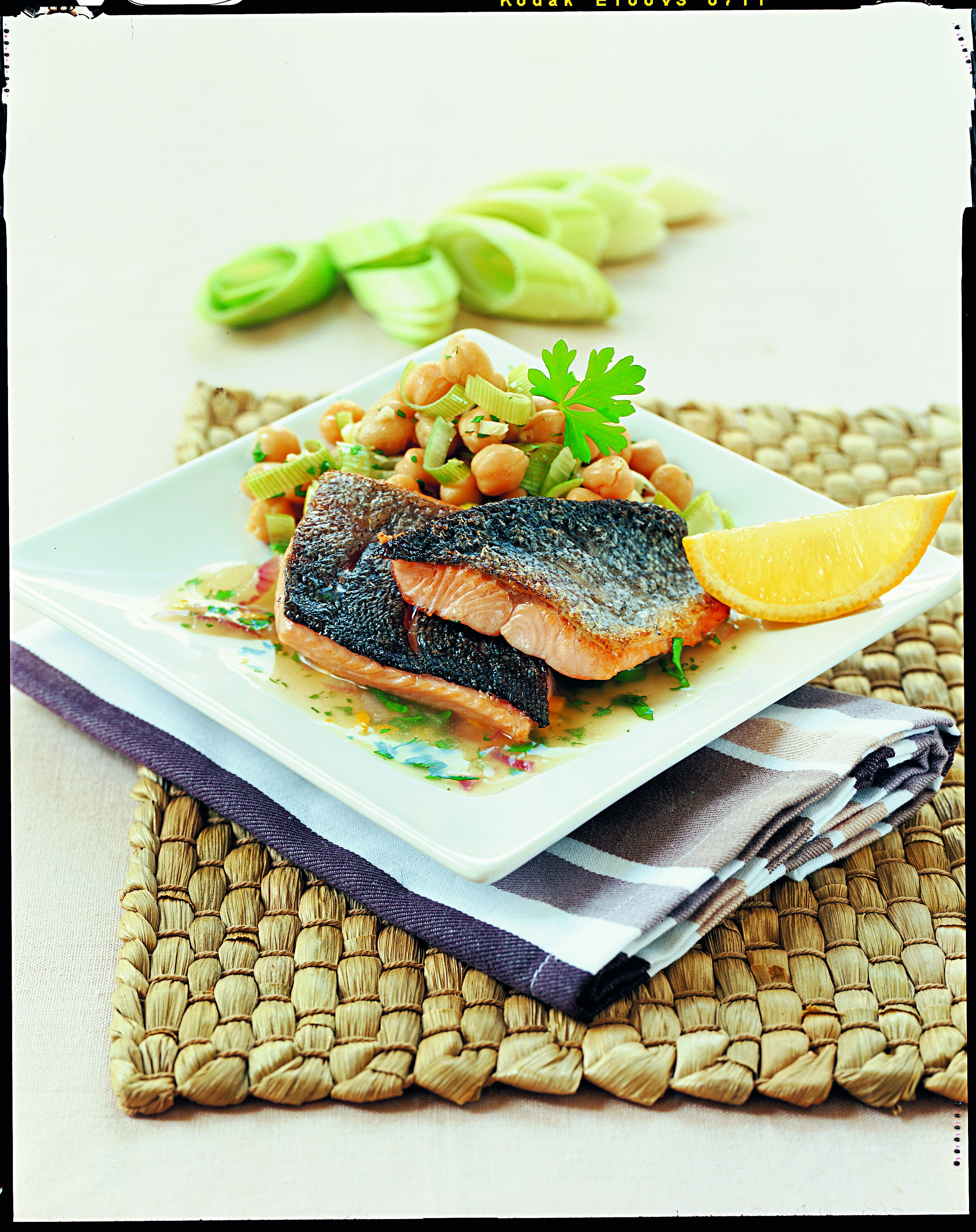 Lauch und Knoblauch im Öl anschwitzen. Kichererbsen untermischen, bei mittlerer Hitze ca. 5 Minuten dünsten; salzen und pfeffern.