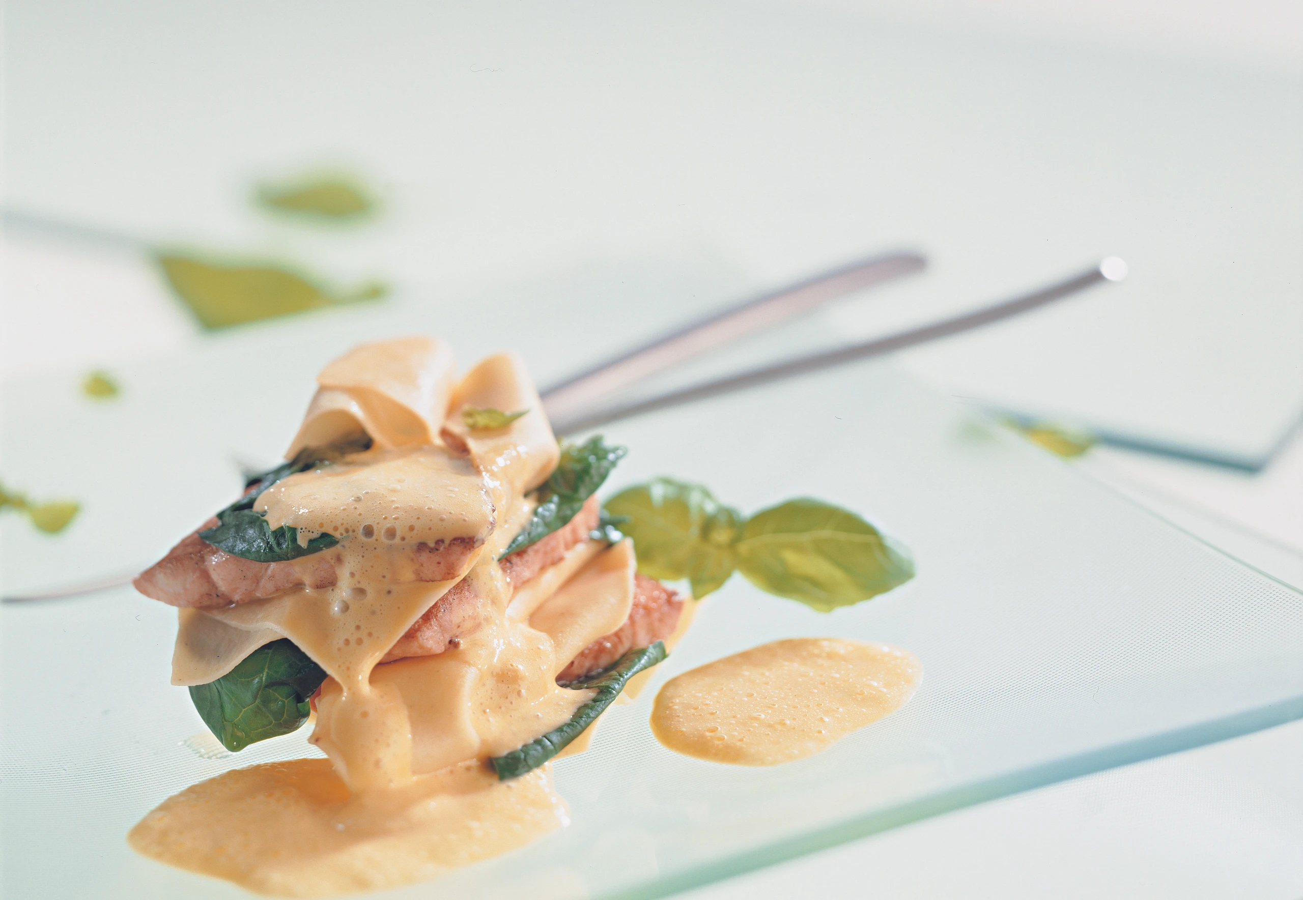 Auf vorgewärmten Tellern mehrere Lagen Lasagneblätter, Lachs und Spinat übereinander schichten. Mit Sauce anrichten.