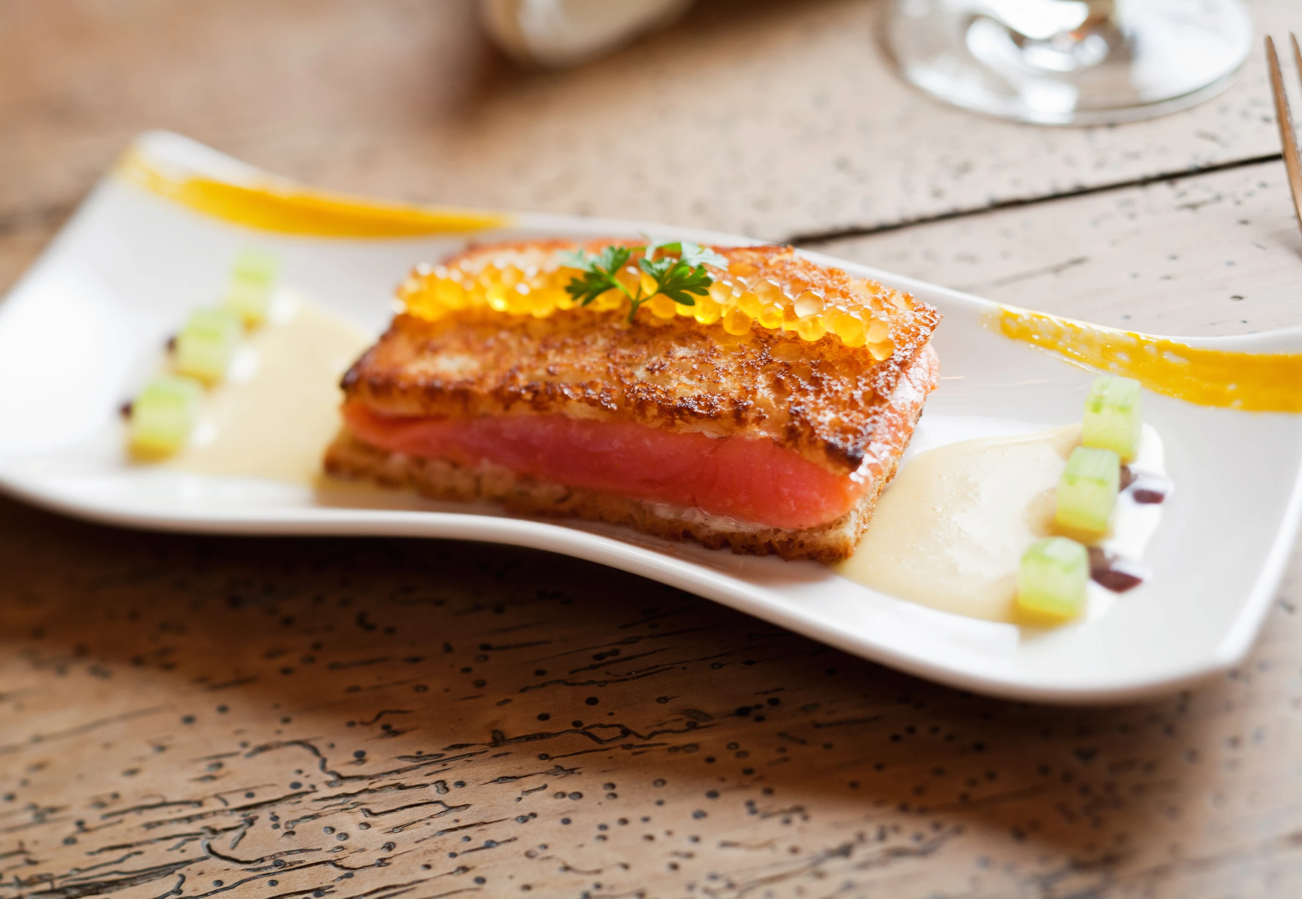 Sandwiches in heißem Öl beidseitig knusprig braten, mit Fischmousse, Sauce, Gurken und Kaviar garniert servieren. Teller eventuell mit Paprikapüree dekorieren.