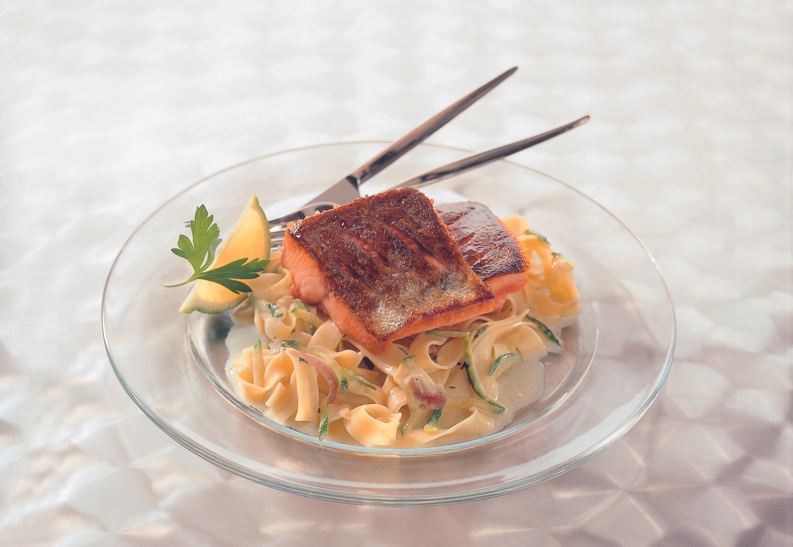 Lachsforellenfilet auf Zucchini-Rahmnudeln
