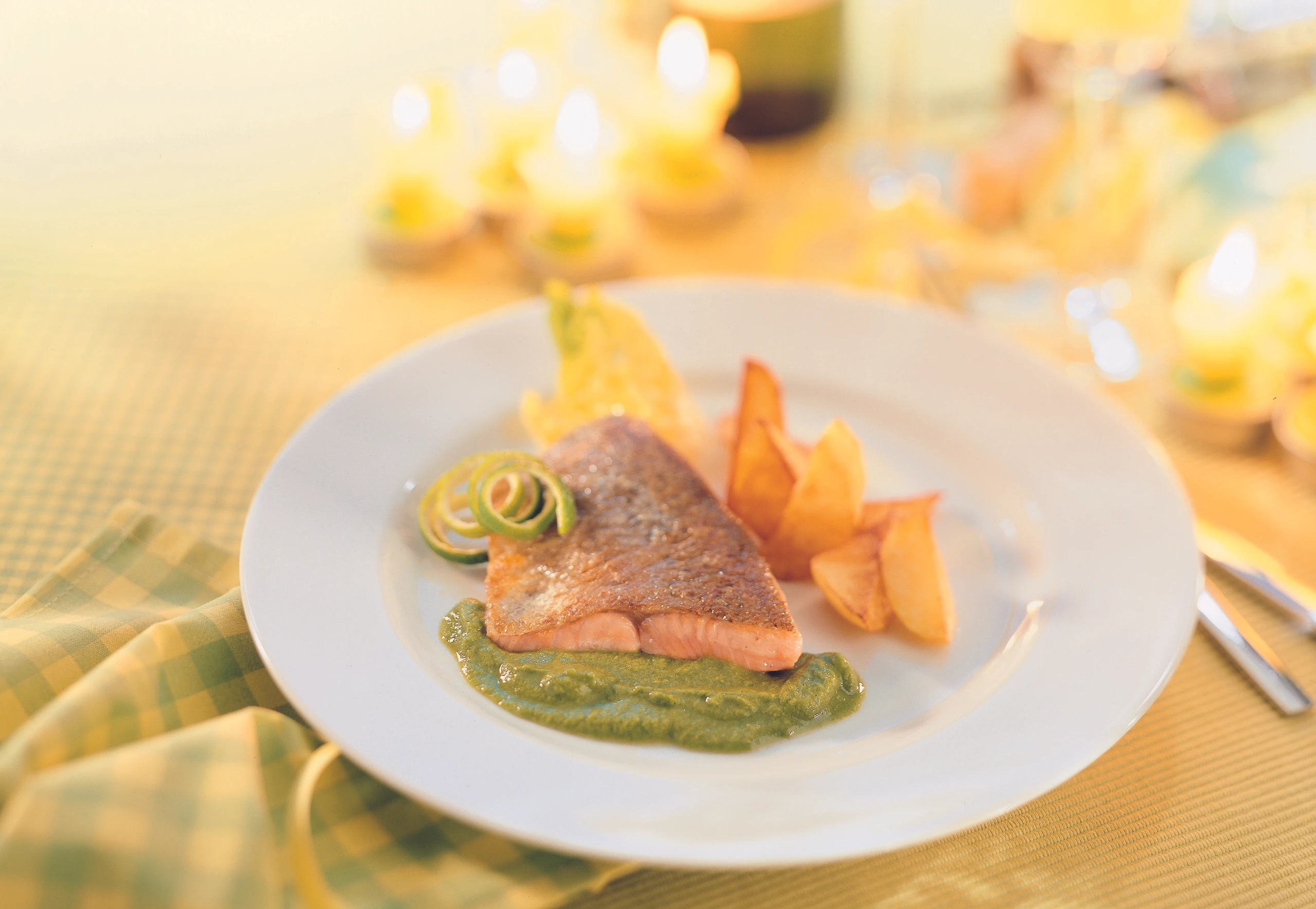Lachsforellenfilet auf cremiger Salatsauce mit gebackenen Erdäpfelspalten