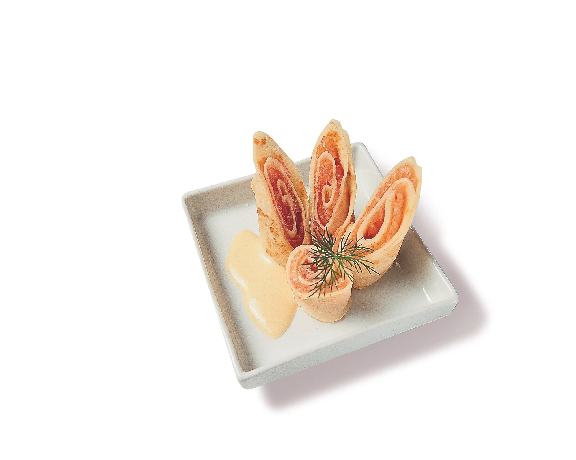 Palatschinken jeweils zu zwei Drittel mit Lachsscheiben belegen. Lachs mit Salz, Pfeffer und Limettensaft würzen und dünn mit Sauce bestreichen. Palatschinken einrollen, mit Frischhaltefolie zudecken und ca. 1 Stunde kühlen.