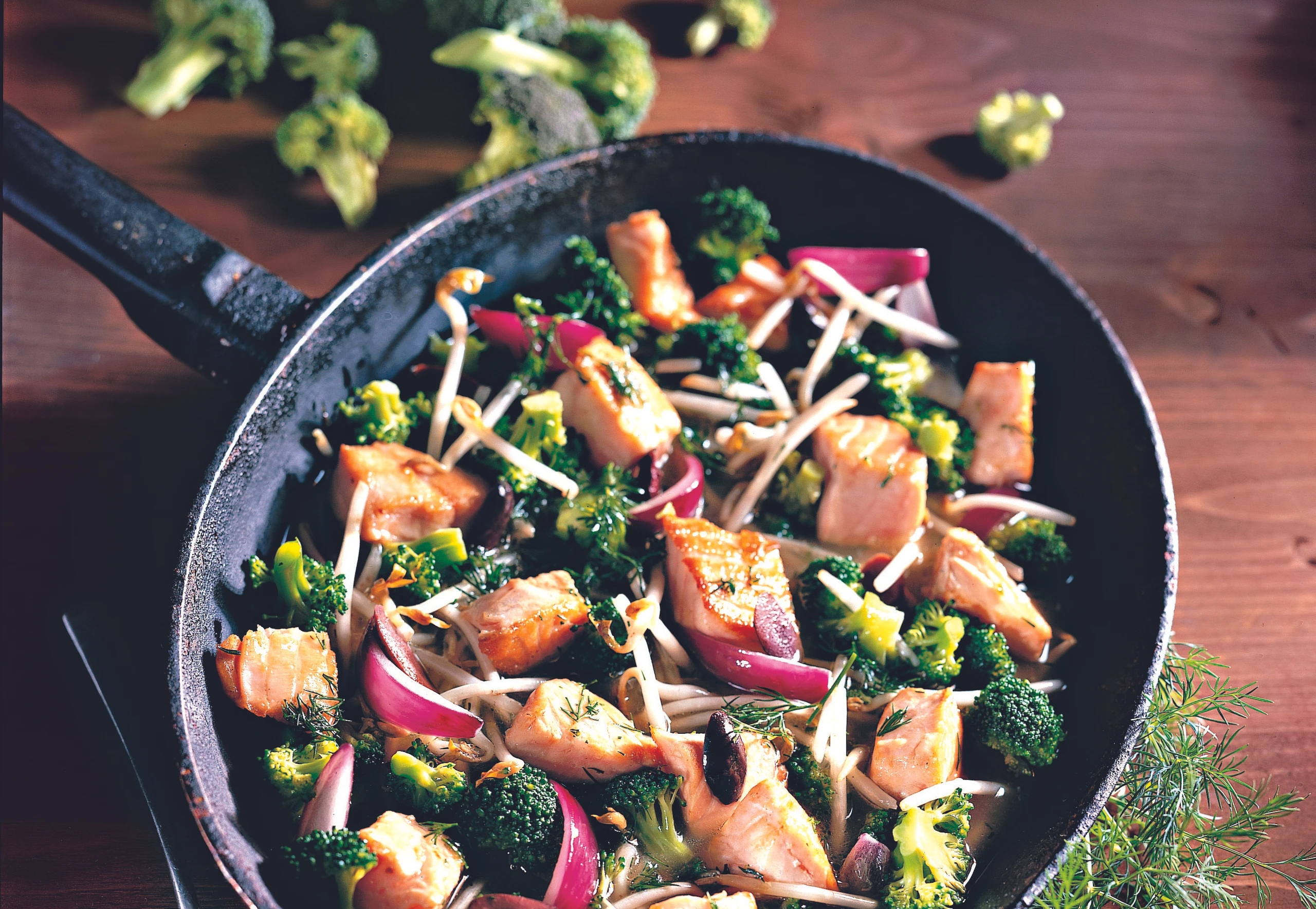 Brokkoli-Lachspfanne mit Erdäpfellaibchen