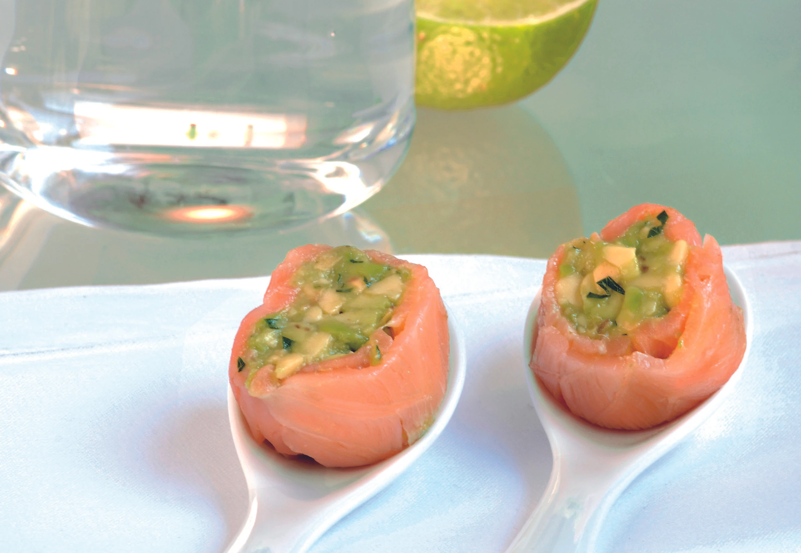 Avocado halbieren, entkernen, schälen und zerdrücken. Petersilie, Limettensaft und Salz untermischen. Lachs mit der Masse bestreichen, einrollen und für ca. 1 Stunde kalt stellen. Rollen in Scheiben schneiden.