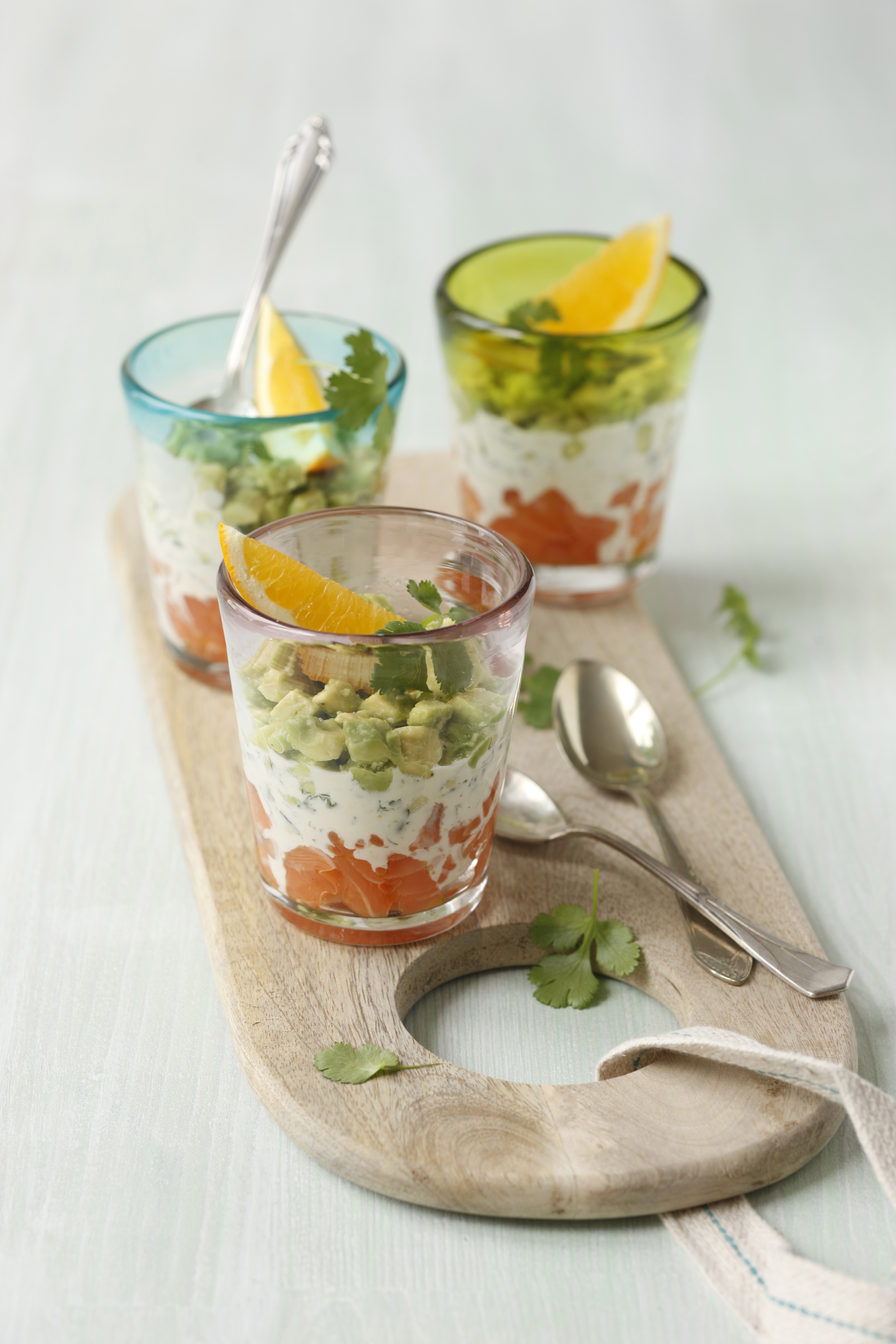 Tatar in Gläser füllen, Orangencreme und marinierte Avocado darauf verteilen. Mit Orangenspalten und Korianderblättchen garnieren.