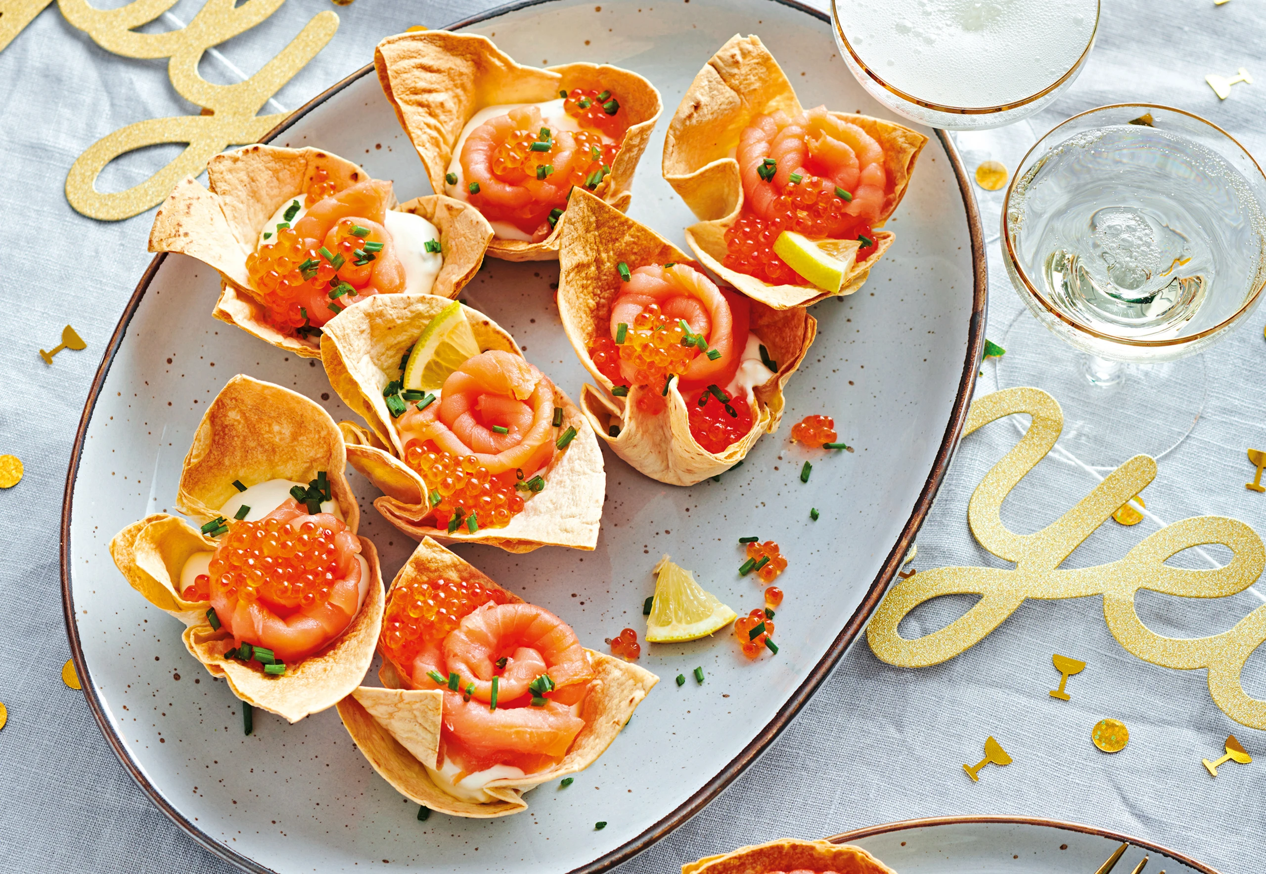 Mousse in die Tortillaschälchen füllen, mit den Lachsrosen belegen. Kaviar darauf verteilen. Zitronenscheiben vierteln. Lachstörtchen mit Zitronenstücken und Schnittlauch garnieren.