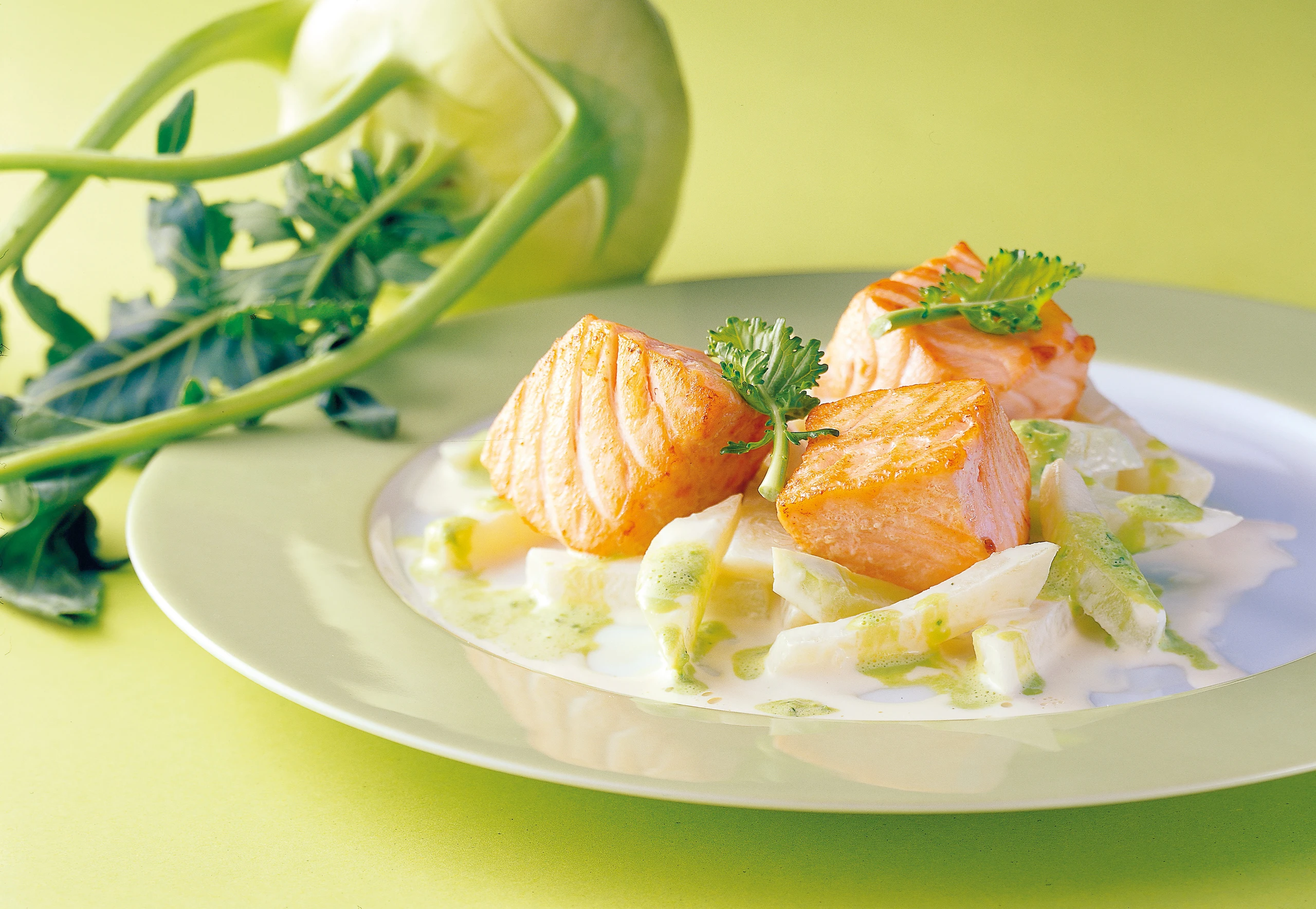Lachs mit Kohlrabi und Sauce anrichten. Dazu passen Erdäpfel.