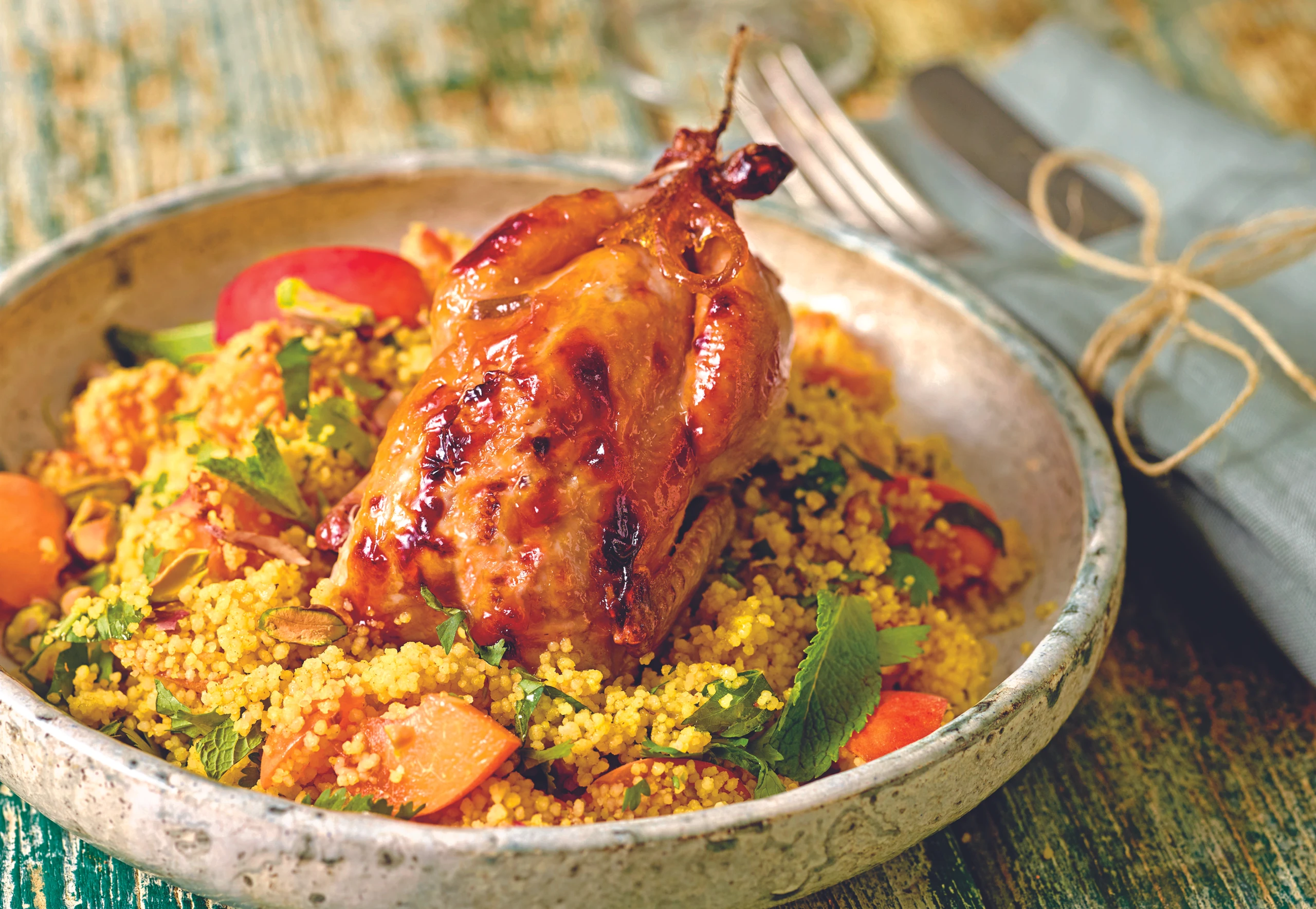 Lackierte Wachteln mit Pistazien-Kräuter-Couscous
