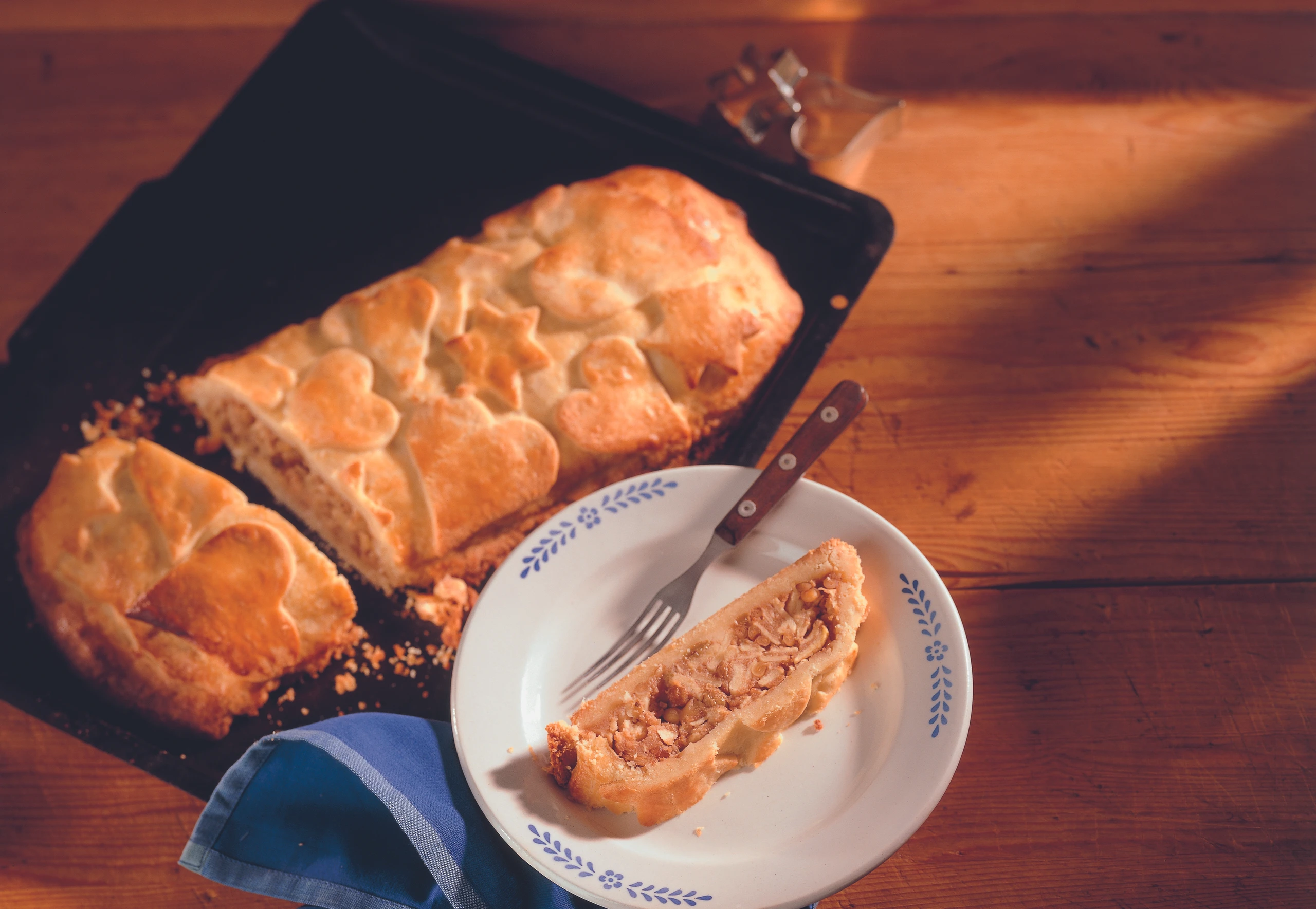 Backrohr auf 200 °C vorheizen. Teig auf einem leicht mit Mehl bestreuten Stück Backpapier ca. 5 mm dick rechteckig (ca. 45 x 40 cm) ausrollen. Teigränder gerade schneiden. Das mittlere Teigdrittel mit der Apfelfülle belegen. Zuerst das untere, dann das obere Drittel des Teiges über die Fülle schlagen, die Enden leicht andrücken.