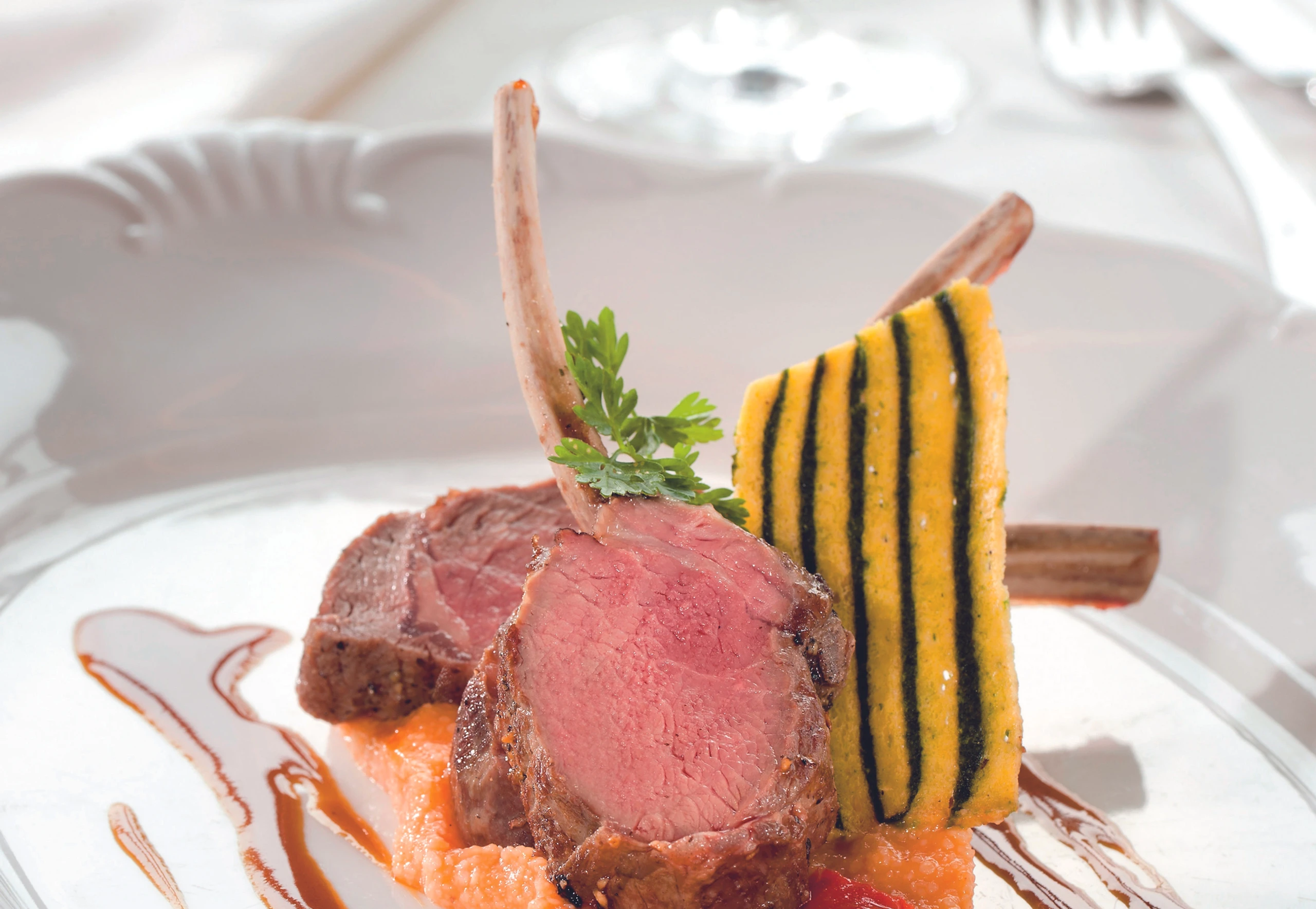 - Lammfond erhitzen. Fleisch in Scheiben schneiden, mit Polenta und Paprikastreifen anrichten, mit Fond und Spinat-Biskuit garniert servieren.