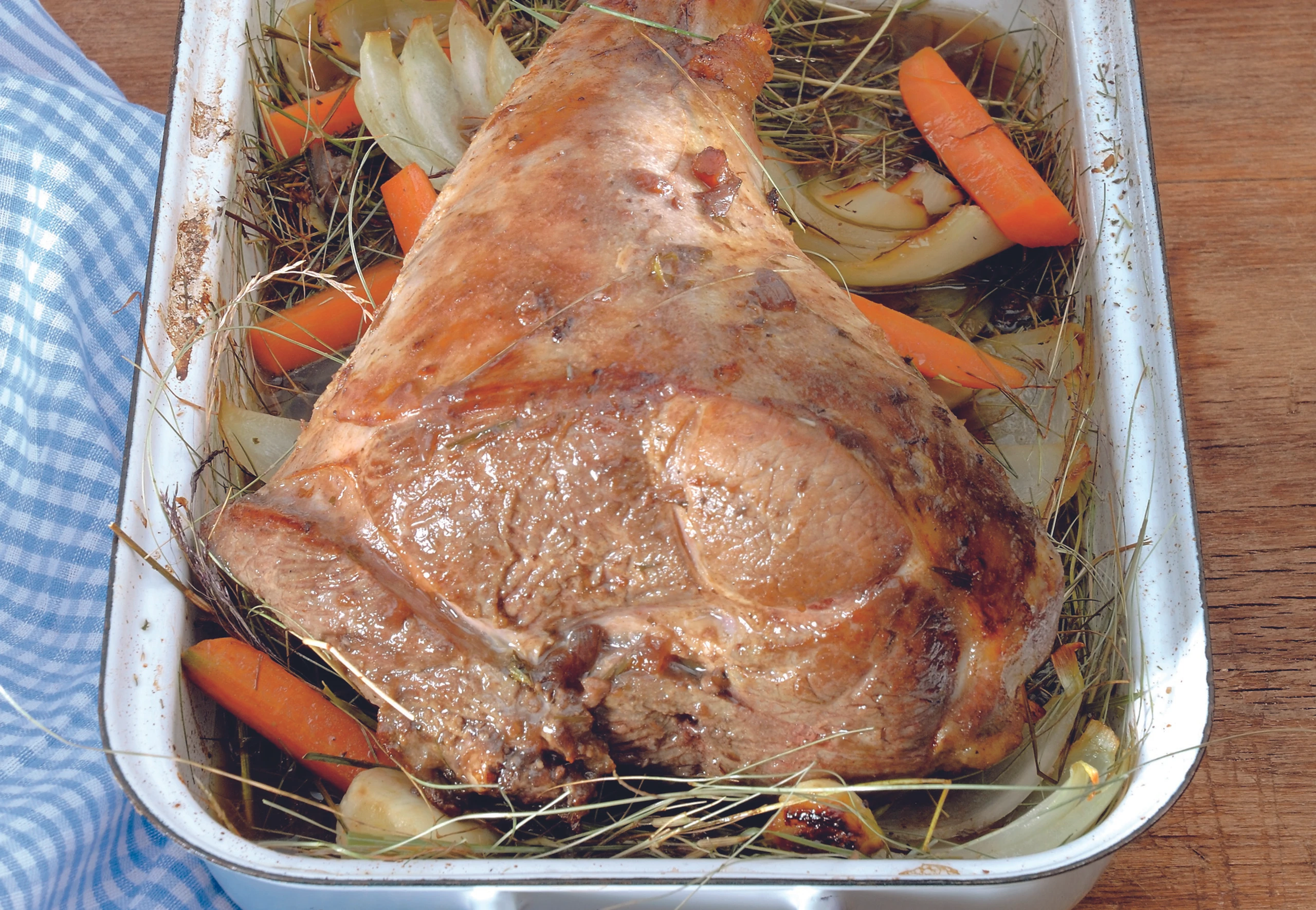 Bratfett abgießen, Bratrückstand mit Wein und 300 ml Wasser aufgießen, aufkochen, zum Lamm gießen – Gemüse und Heu sollen mit Flüssigkeit bedeckt sein; evtl. Wasser und Wein (1:1) zugießen. Fond aufkochen, Topf mit Alufolie verschließen. Keule im Rohr 90 Minuten garen (unterste Schiene).