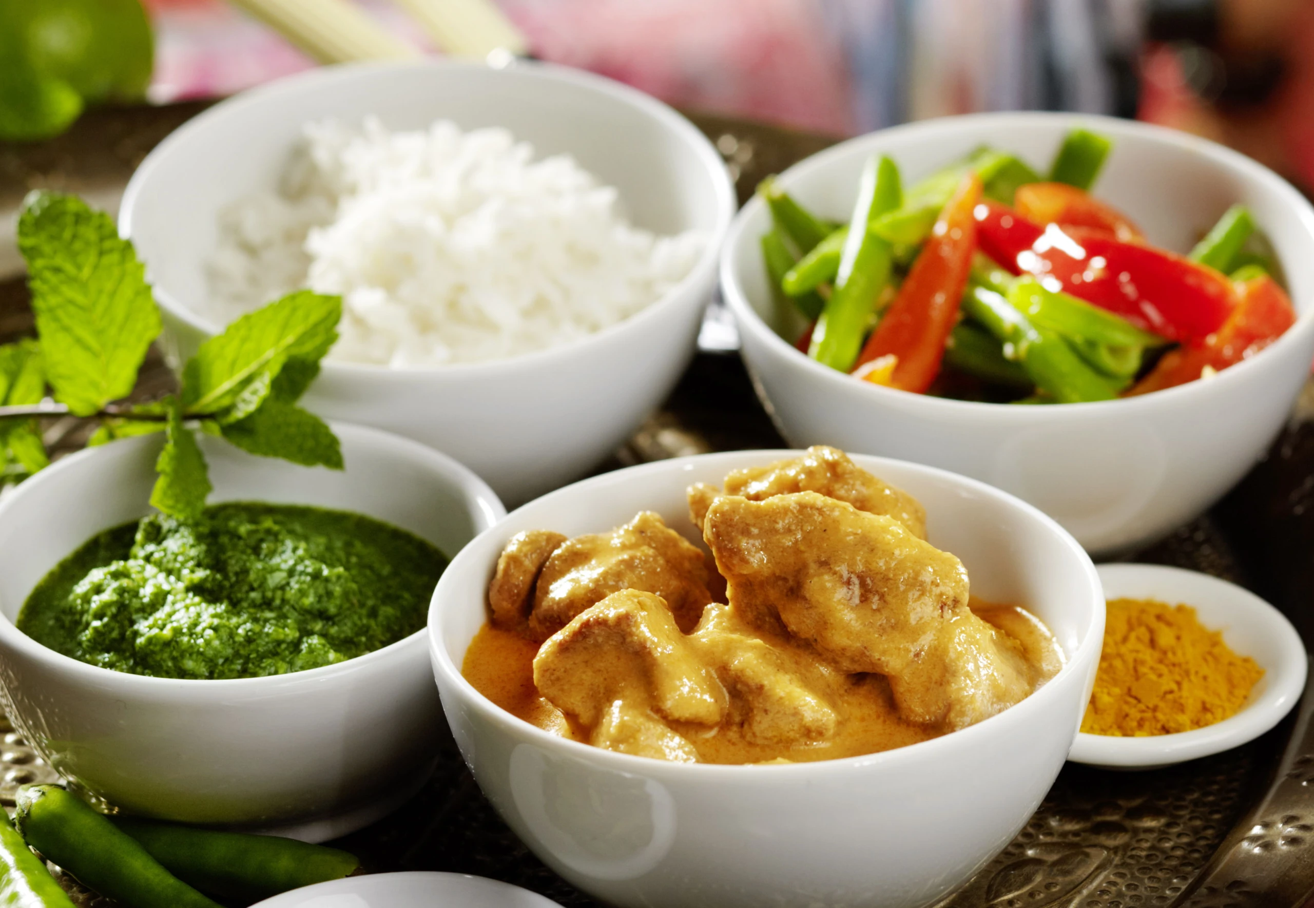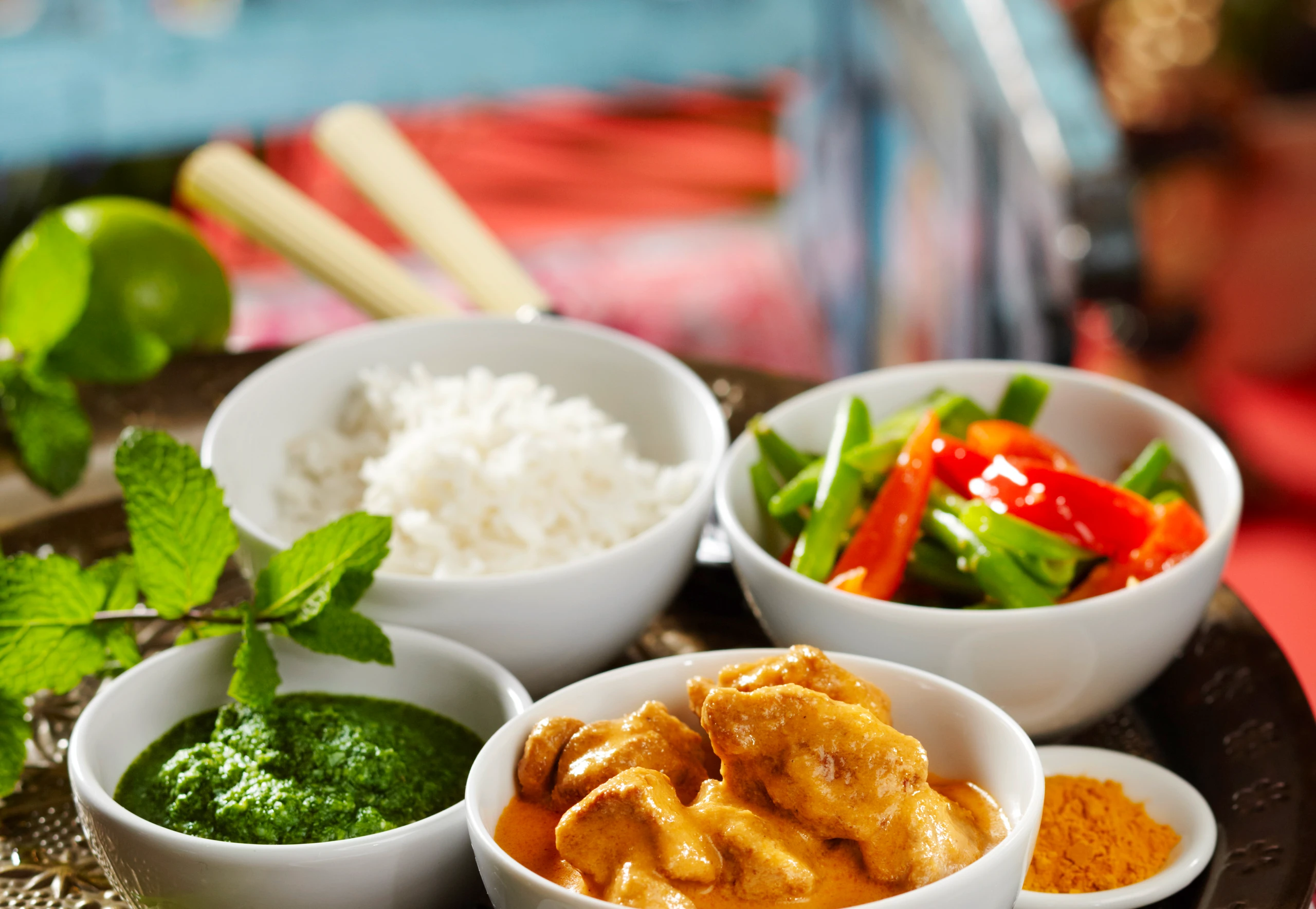 Lamm in Joghurt-Sauce mit Paprika-Fisolen-Curry und Minze-Chutney
