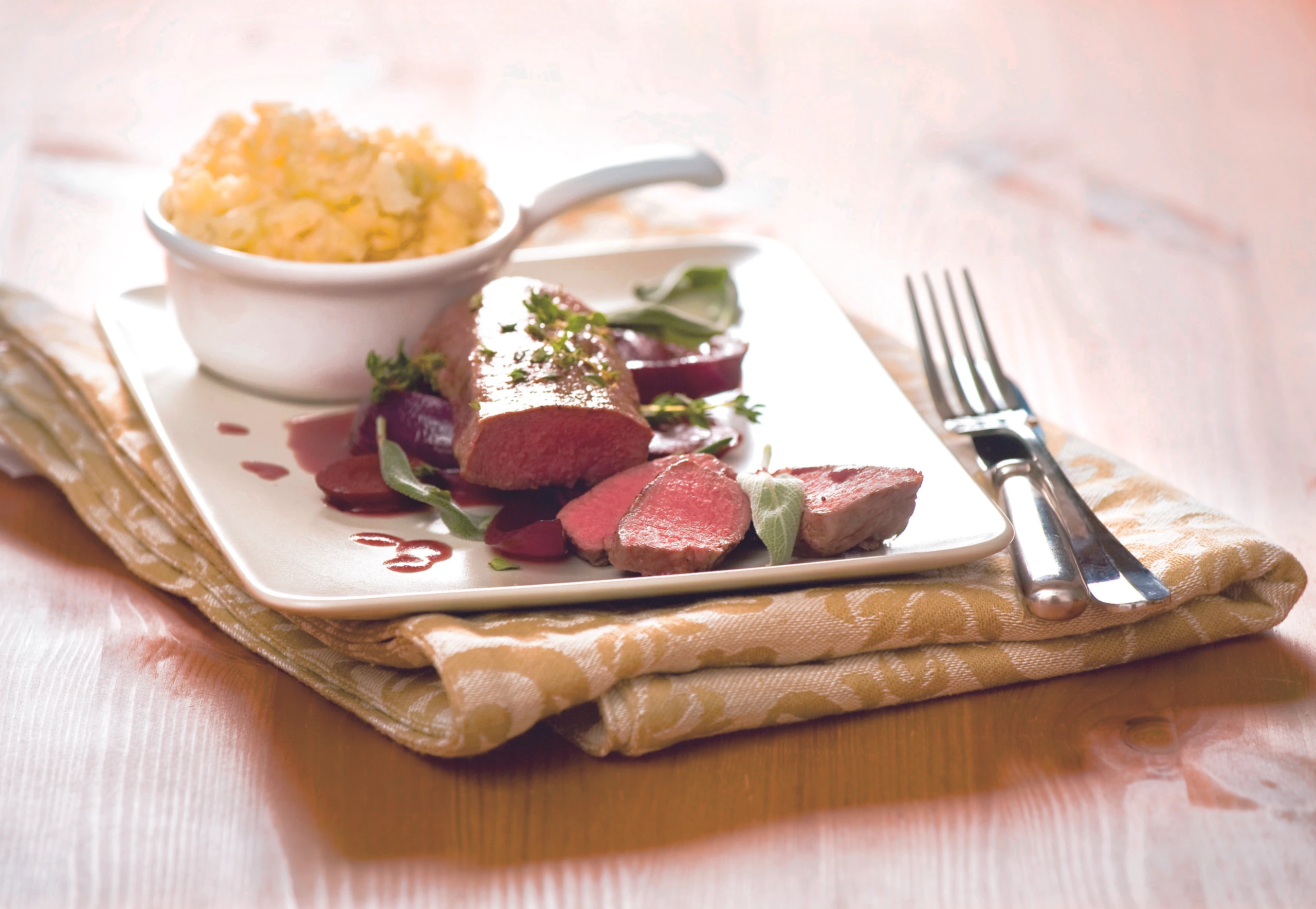 - Fleisch kurz rasten lassen, den Dämpf-Fond noch etwas einkochen. Mit Fleisch und Sellerie-Polenta servieren.