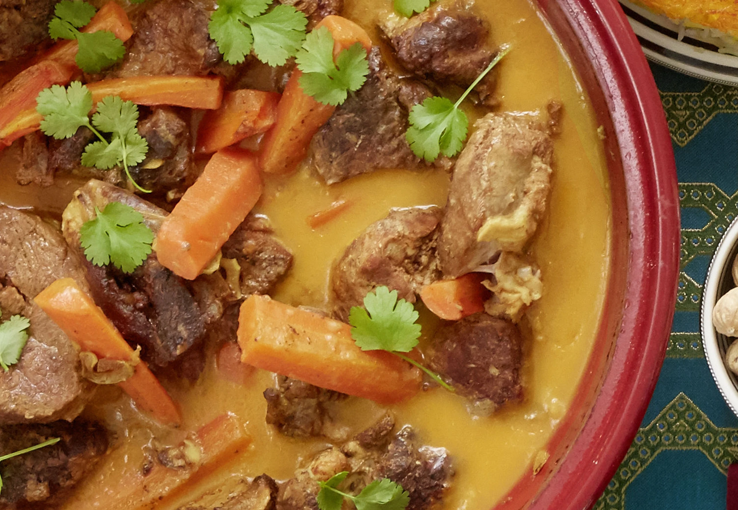 Tajine abdecken, ins Rohr stellen (unterste Schiene / Gitterrost) und ca. 5 Stunden garen. Herausnehmen, salzen und pfeffern. Mit Koriander bestreut servieren.