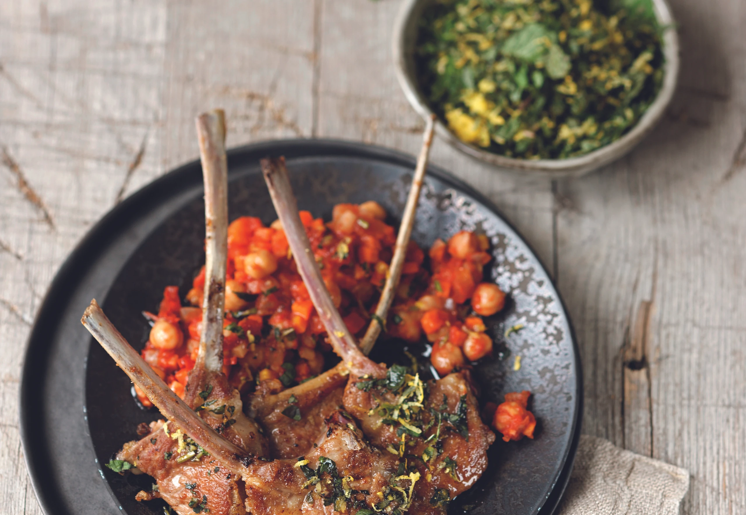 Lammkronen in insgesamt 12 Koteletts schneiden und mit Salz und Pfeffer würzen. Zitronenschale mit Minze mischen und beiseite stellen.