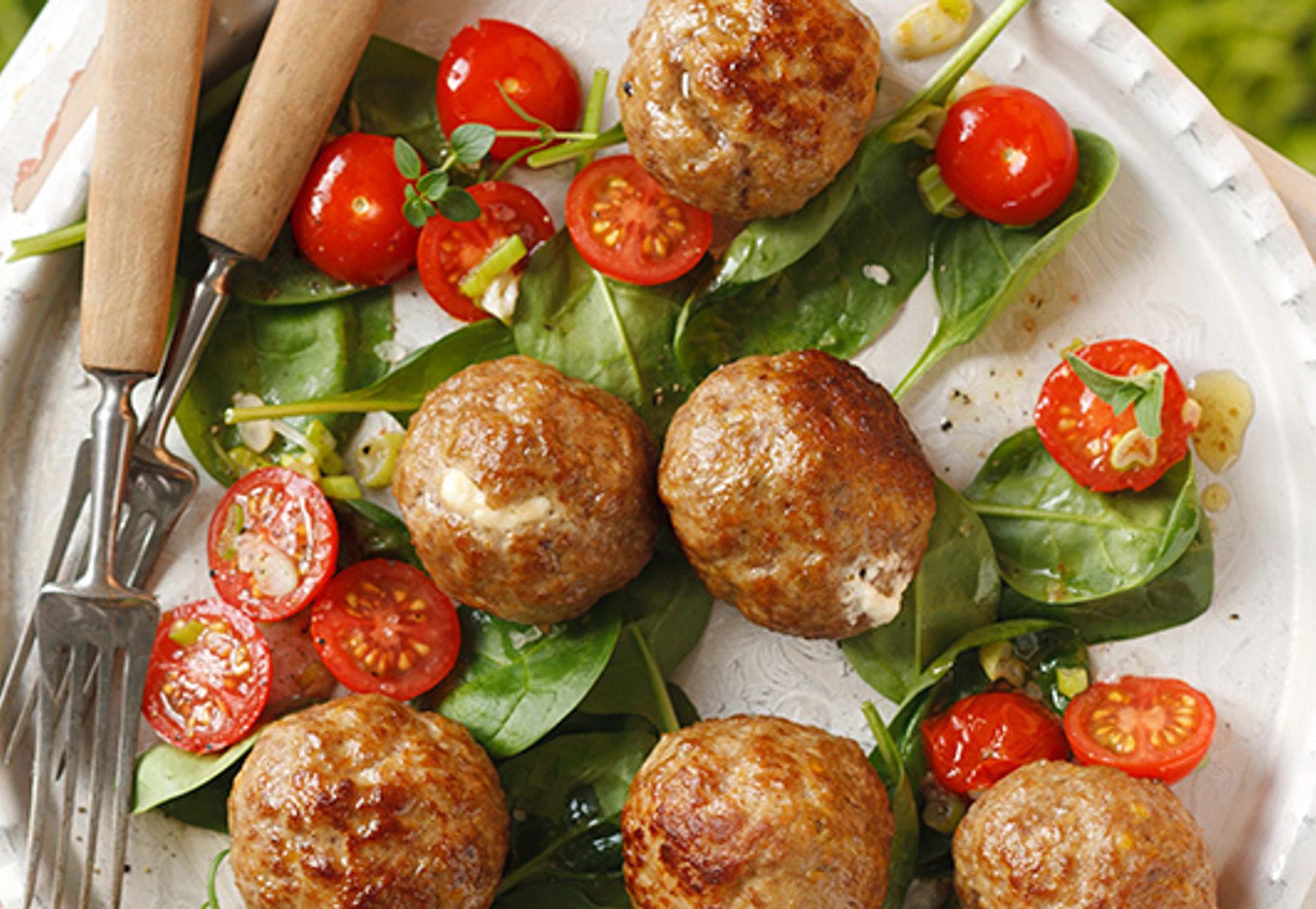 Für die Marinade 3 EL Zitronensaft salzen, pfeffern und mit 3 EL Öl vermischen. Kirschparadeiser halbieren. Jungzwiebeln putzen und quer in Ringe schneiden. Paradeiser, Jungzwiebeln und Spinat mit der Marinade vermischen. Fleischbällchen mit dem Salat anrichten.
