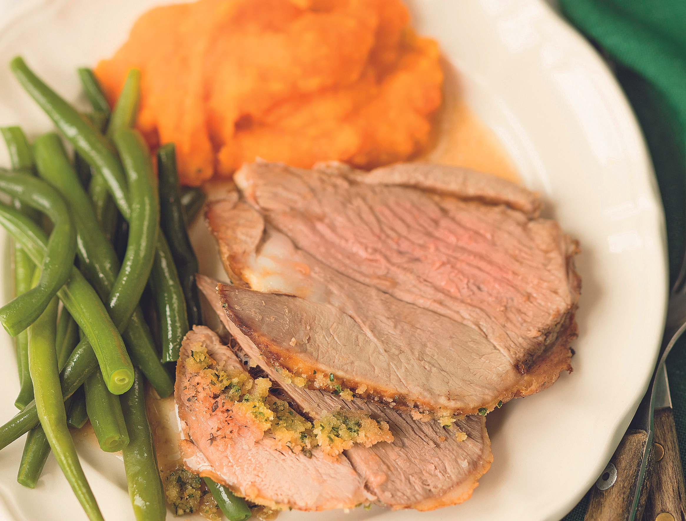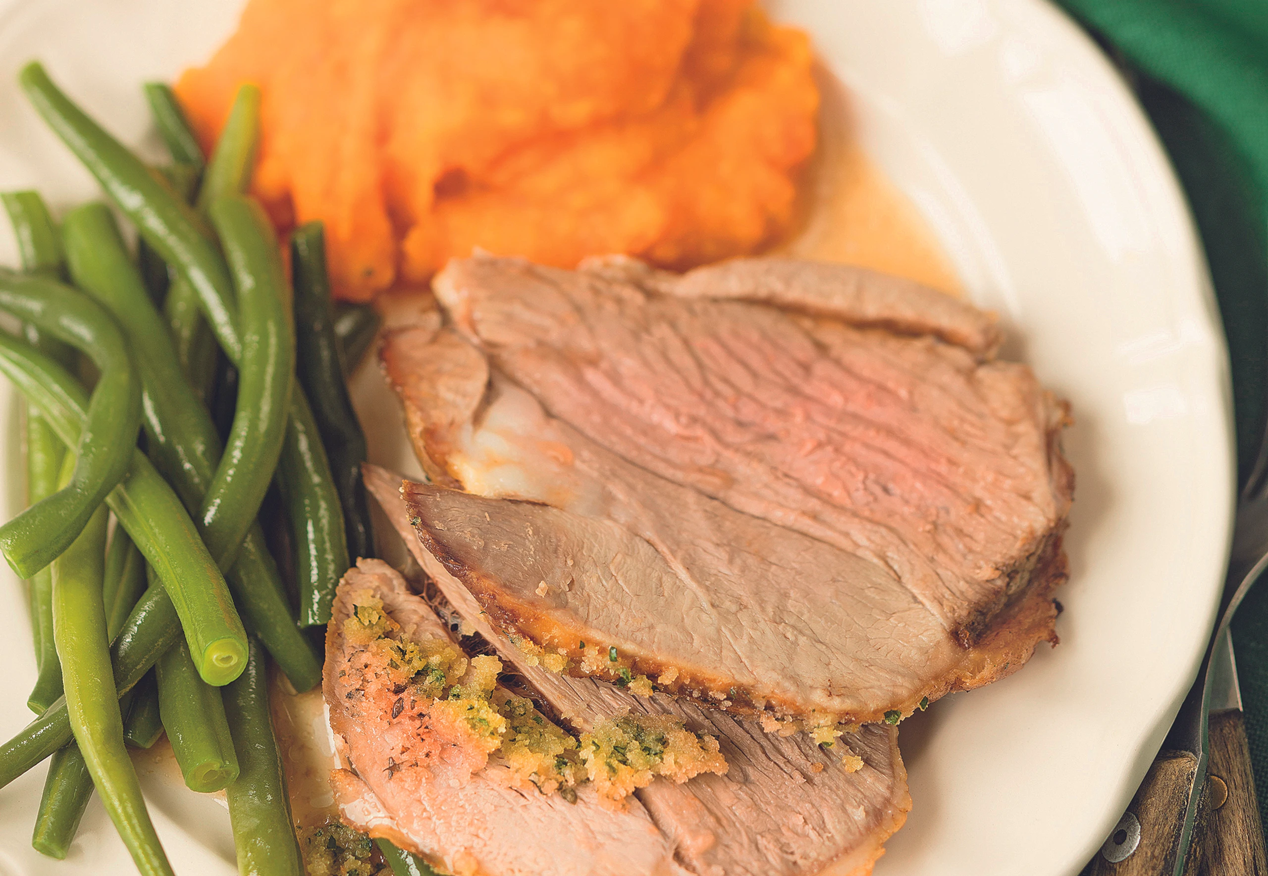 Fleisch mit der Bröselmasse bedecken und im Rohr bräunen. Fleisch portionieren und mit dem Saft anrichten. Dazu passen Kürbispüree und Fisolen.