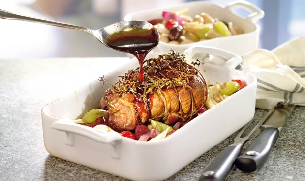 - Spagat entfernen, Fleisch rasten lassen, in Scheiben schneiden. Mit Gemüse und Polenta anrichten.