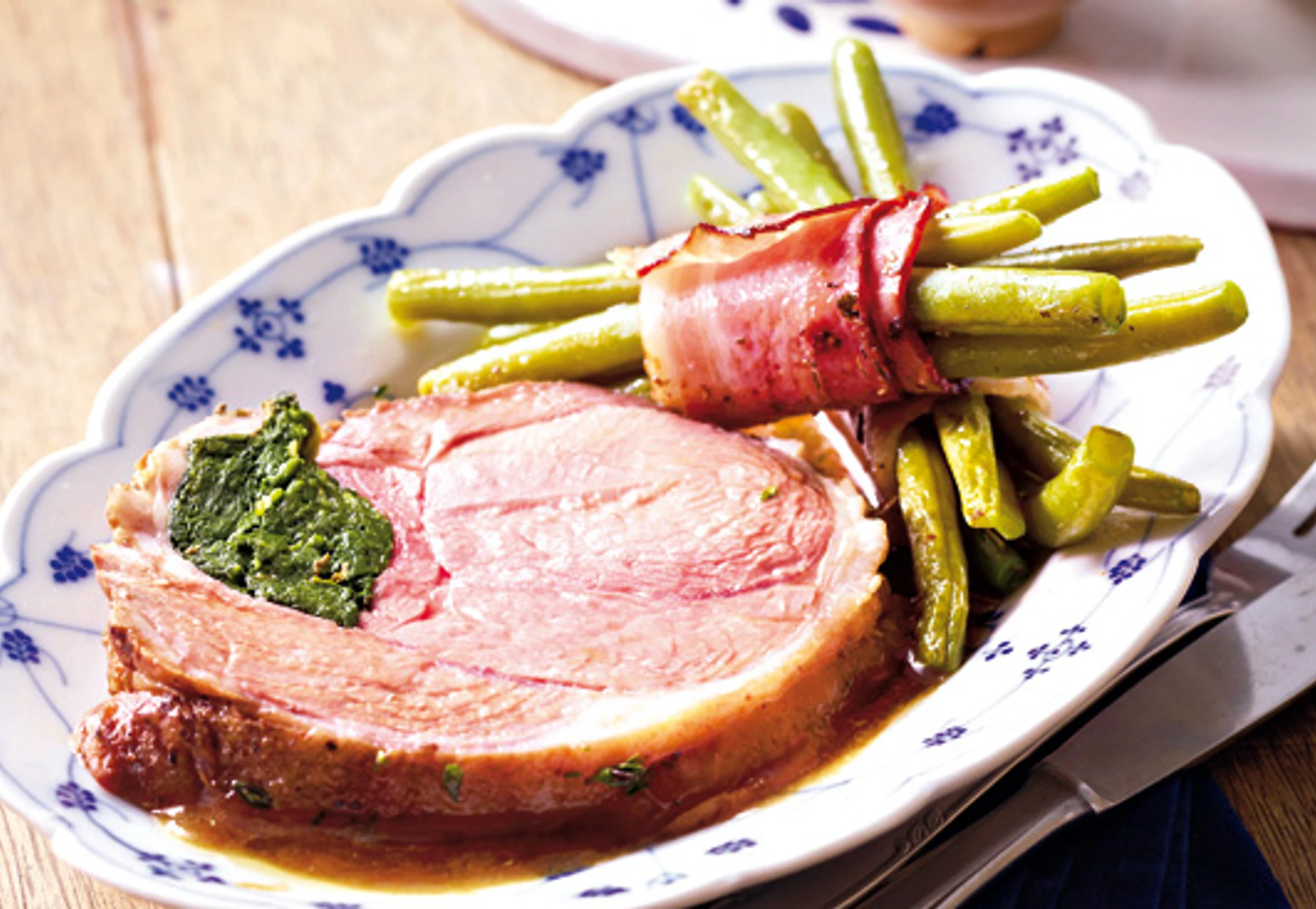 - Fleisch herausnehmen und warm stellen. Bratensaft abseihen. Spagat vom Fleisch entfernen. Fleisch portionieren, mit Saft und Speckfisolen anrichten.