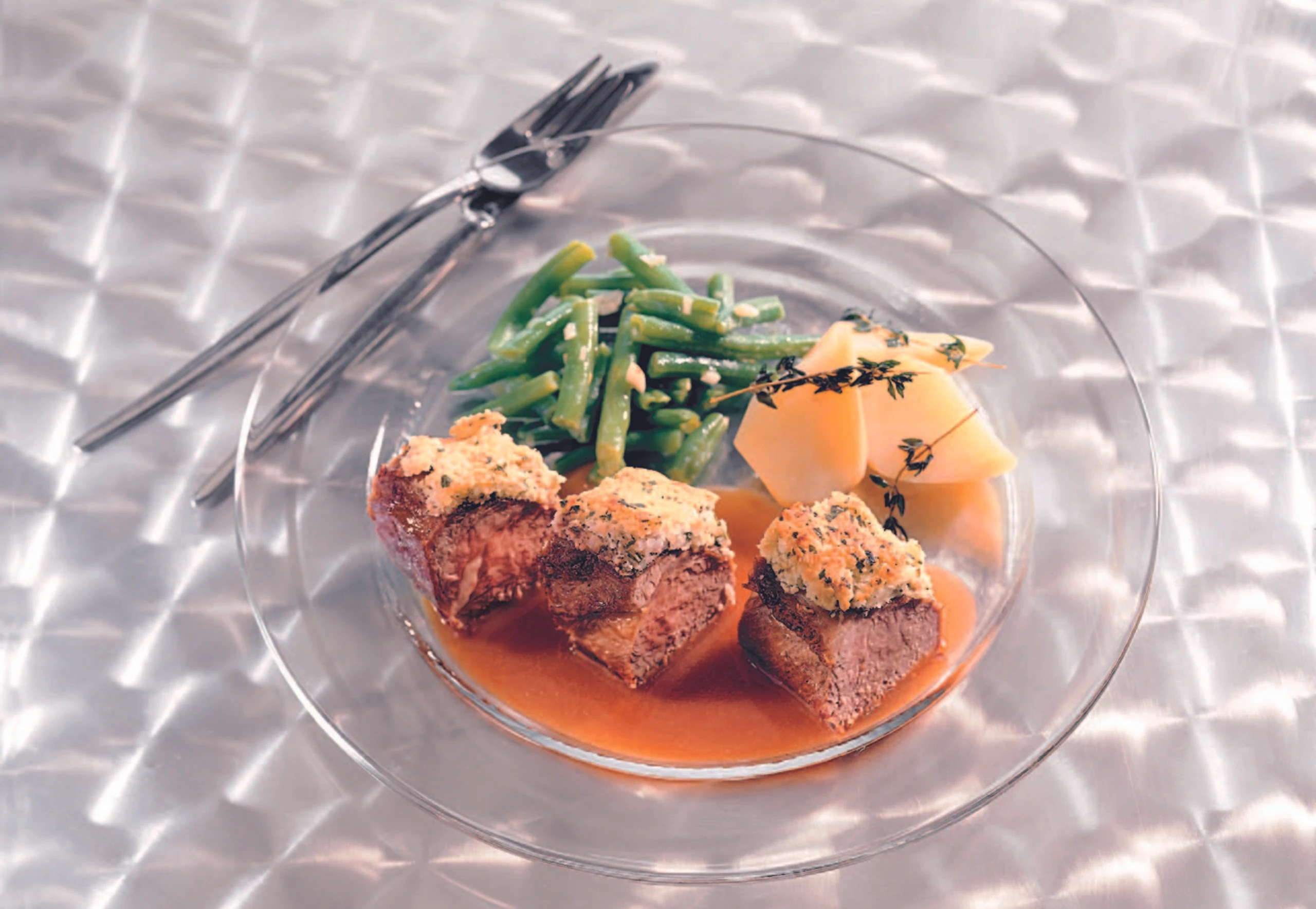 Parallel dazu Bratfett abgießen, Bratrückstand mit Bratensaft aufgießen und aufkochen. Sauce mit Senf verfeinern. Fleisch mit Sauce, Fisolengemüse und Salzerdäpfeln anrichten. Wenn es schneller gehen soll, serviert man statt der Erdäpfel Fladenbrot.