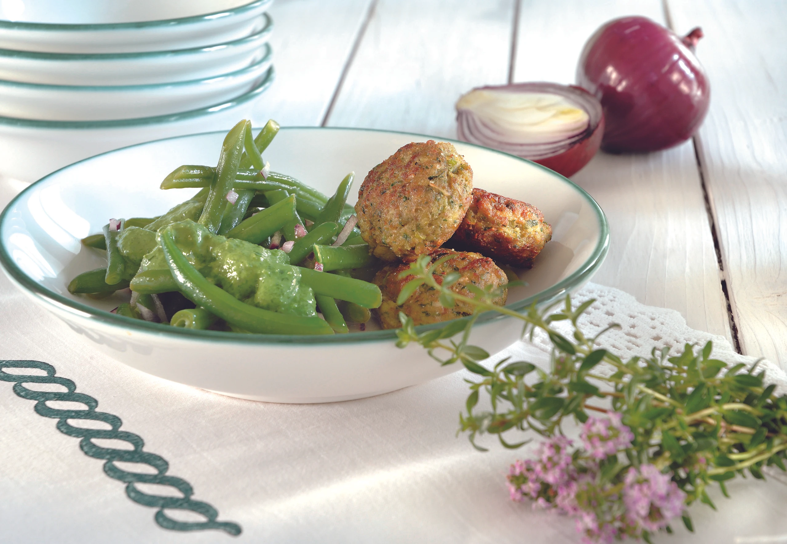 Lammfleisch-Erdäpfel-Laibchen mit Fisolensalat