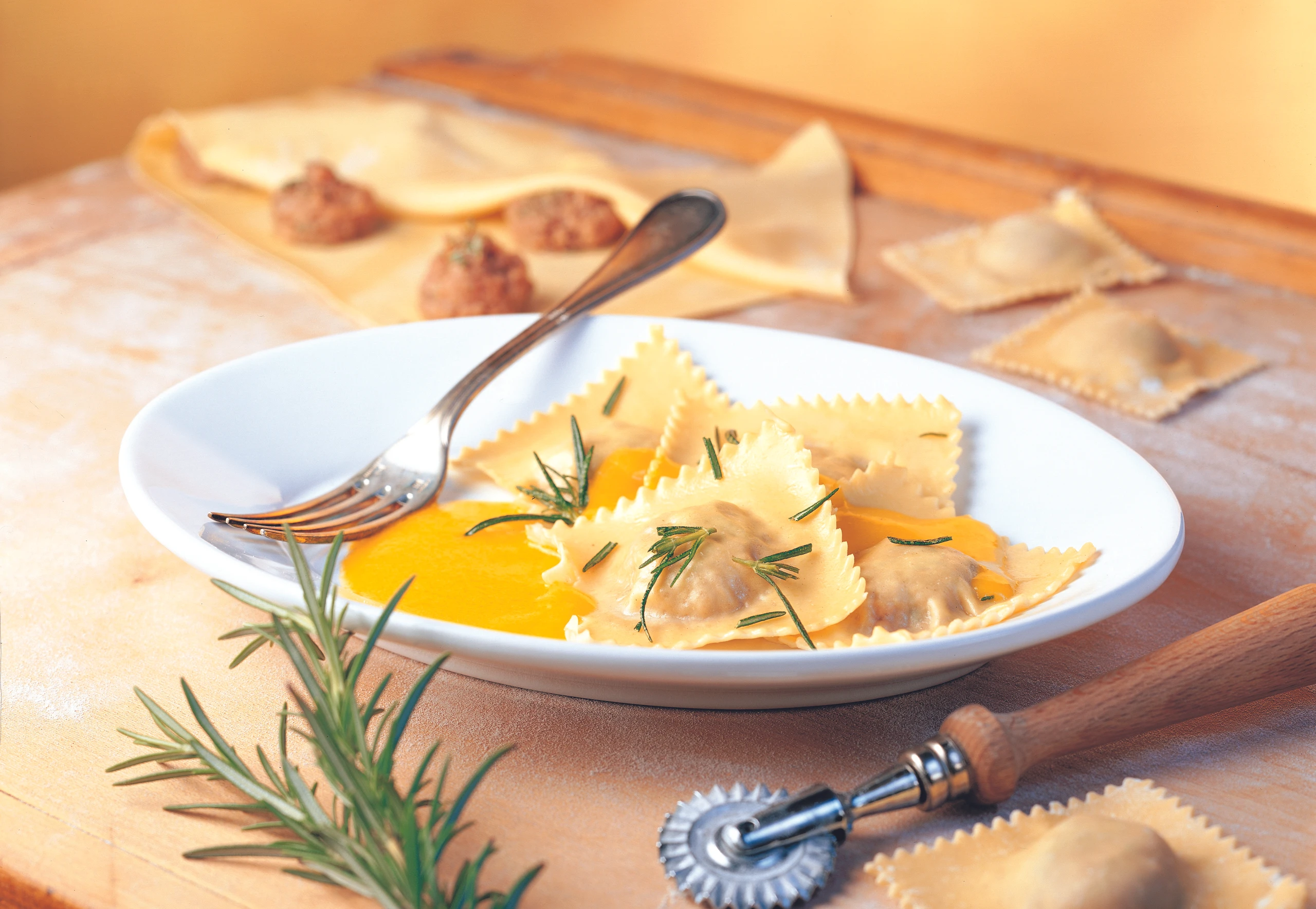 Teig auf einer bemehlten Arbeitsfläche dünn ausrollen und in 2 Streifen schneiden. Auf 1 Streifen im Abstand von 5 cm Gupferln von der Fülle setzen. Zwischenräume mit Wasser bestreichen. Zweites Teigblatt darüber legen. Teig um die Fülle vorsichtig andrücken, so dass möglichst keine Luft in den Ravioli bleibt. Mit der stumpfen Seite eines runden Ausstechers den Teig rund um die Fülle andrücken und mit einem Teigrad ca. 5 cm große Quadrate ausschneiden.